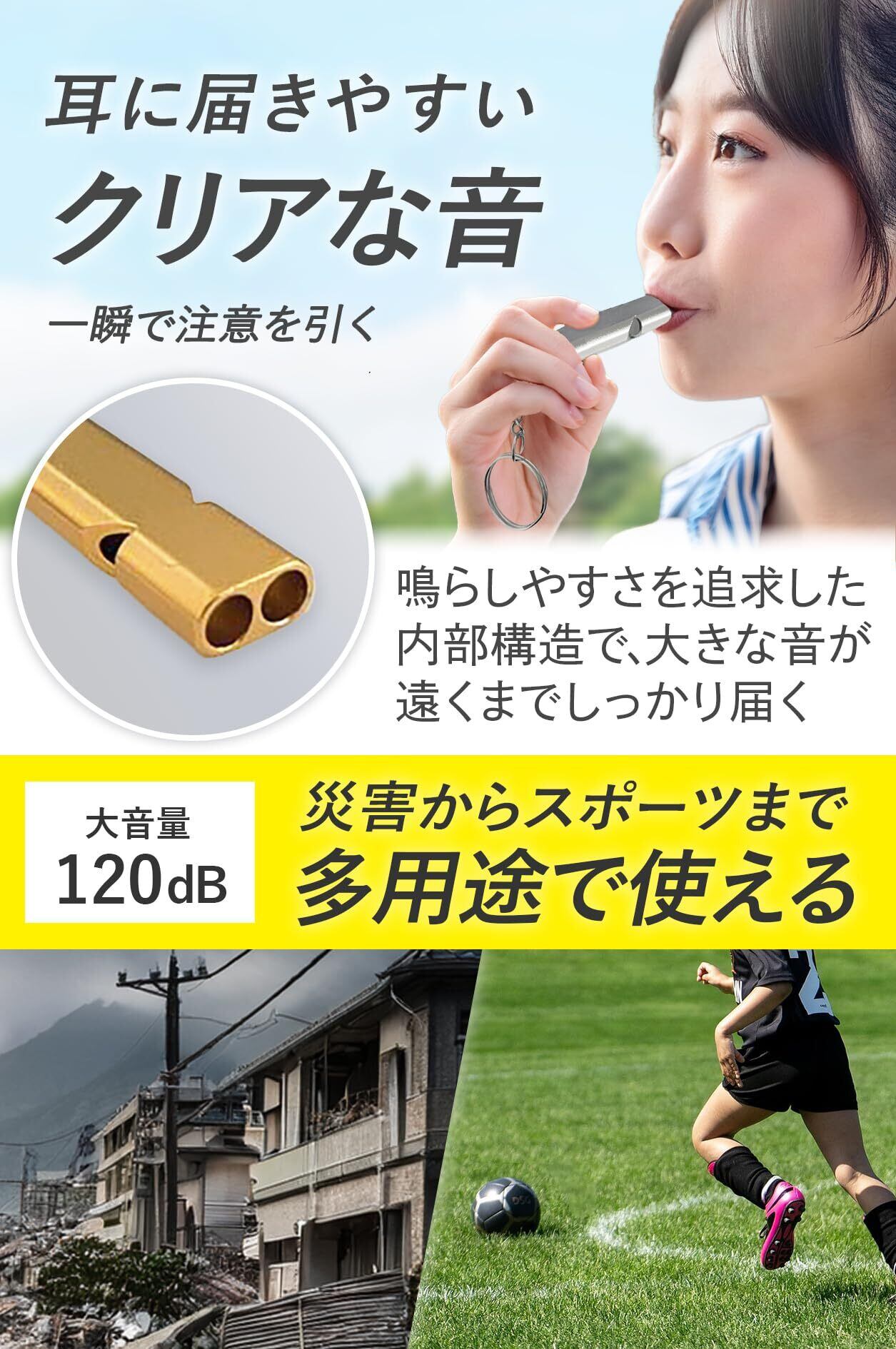 ■【安心の大音量ホイッスル!】このホイッスルは、最大120dBの大音量を誇り、緊急時に周囲にしっかりとアピールできます。日常のアウトドア活動や防災対策として、ぜひ一つは持ちたいアイテムです!