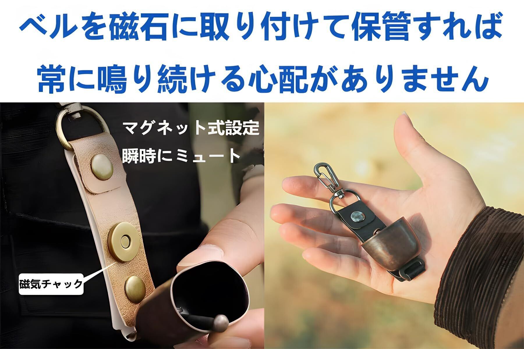 【静音】熊よけ鈴にはミュート機能が付いています。金属製のベルをレザーストラップのマグネットに取り付けるだけで、瞬時にミュートできます。また、指一本でミュートのオン/オフを切り替えることもできます。