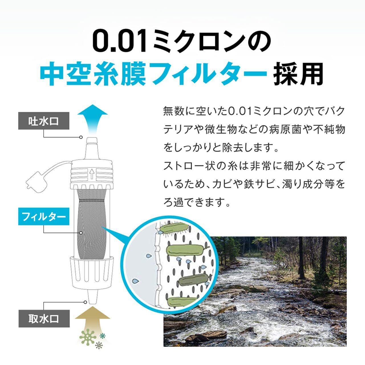 1.除去率99.99999% バクテリアや大腸菌などをしっかりと除去して取り除きます。泥水を一瞬で飲み水に変えることが可能です。 2.フィルター交換なしで5000Lの浄水が可能 フィルター交換がなくて500mlのペットボトル1万本分が浄水できます。