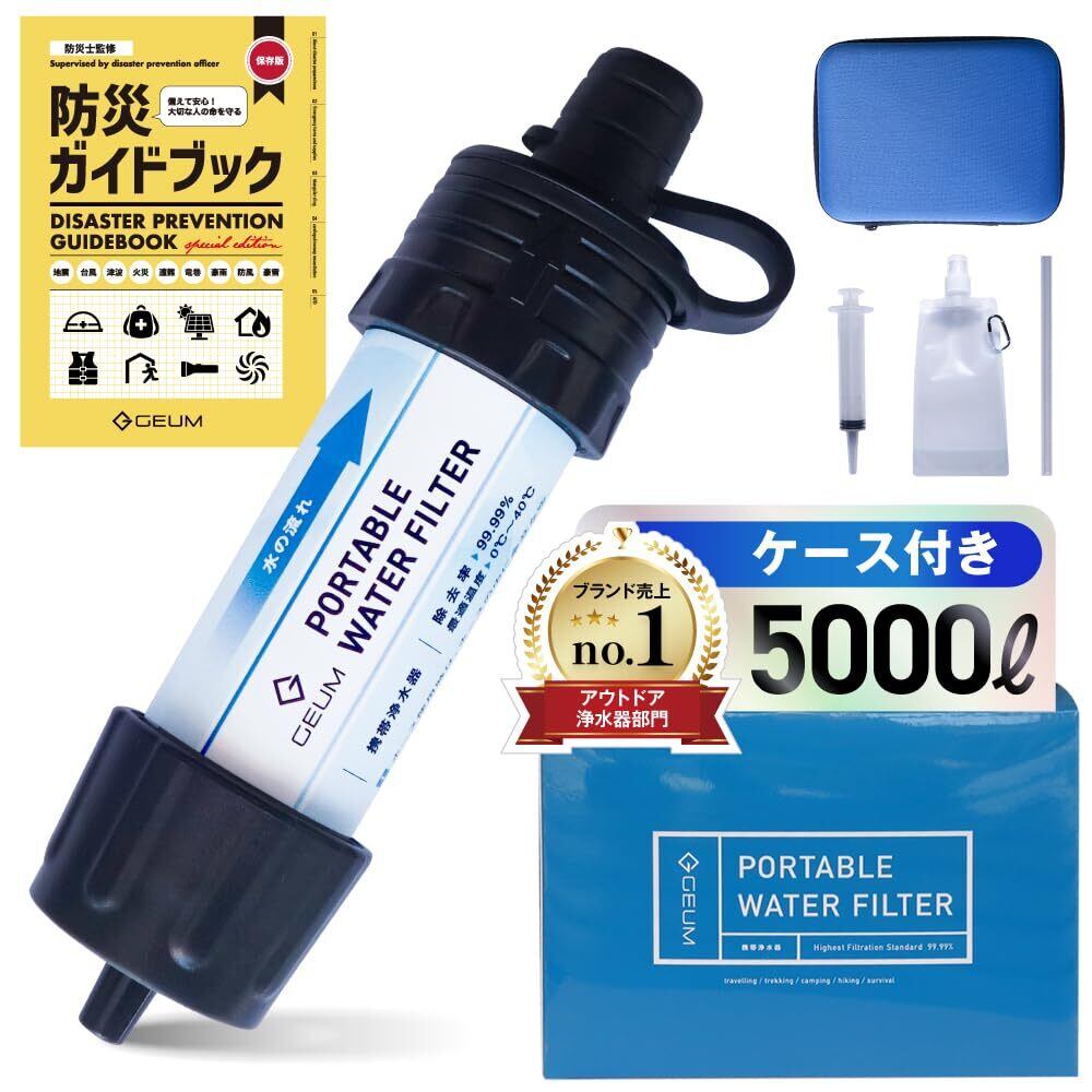 GEUM 防災士監修 携帯浄水器 収納ケース付き 除去率 99.99999% 5000L 浄水器 携帯用浄水器 防災グッズ 軽量 コンパクト アウトドア サバイバル 地震 災害 説明書&防災ガイドブック付き GEUM024