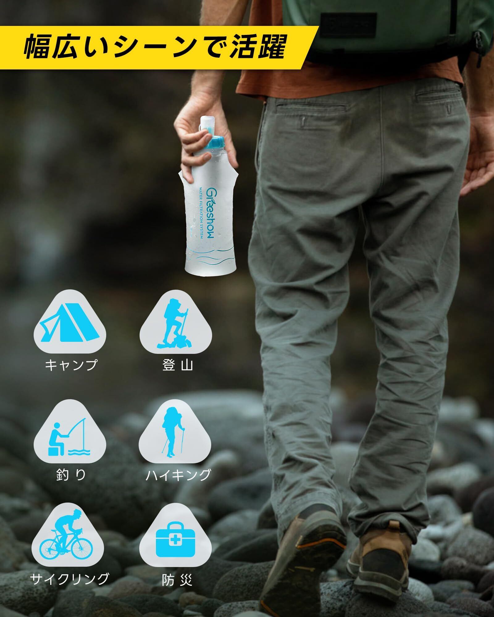 ■【防災とアウトドアの必需品!】この「GreeShow 浄水ボトル」は、緊急時に役立つだけでなく、キャンプや登山などのアウトドア活動にも最適です。直飲みタイプの携帯浄水器で、安全で美味しい水をいつでも簡単に確保できます。