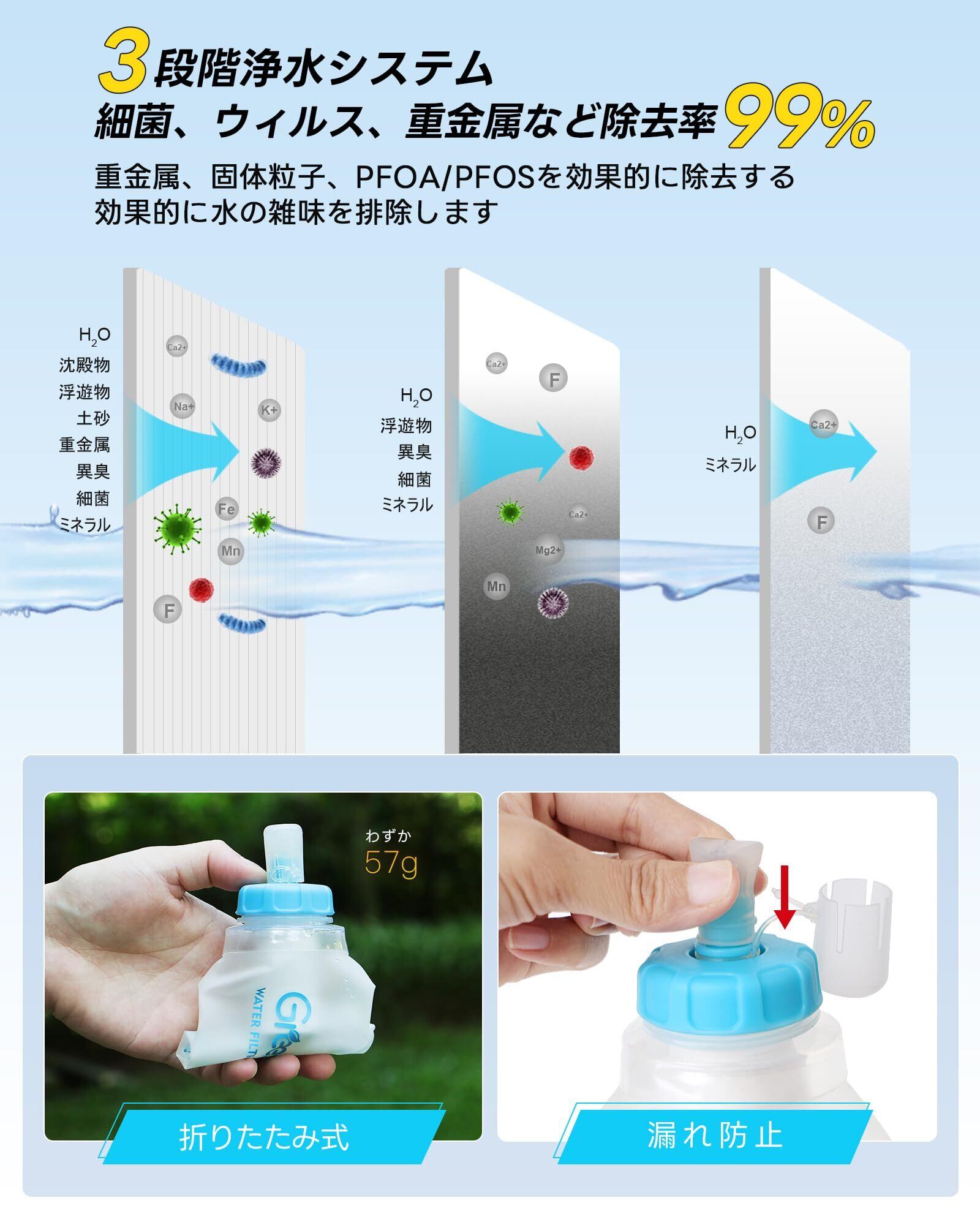 ■【軽量・コンパクト設計!】GreeShowの浄水ボトルは、驚くほど軽量で持ち運びが容易です。リュックに入れても邪魔にならず、アウトドアや旅行の際にも手軽に持ち運べます。防災用としても最適で、備蓄にも役立ちます。