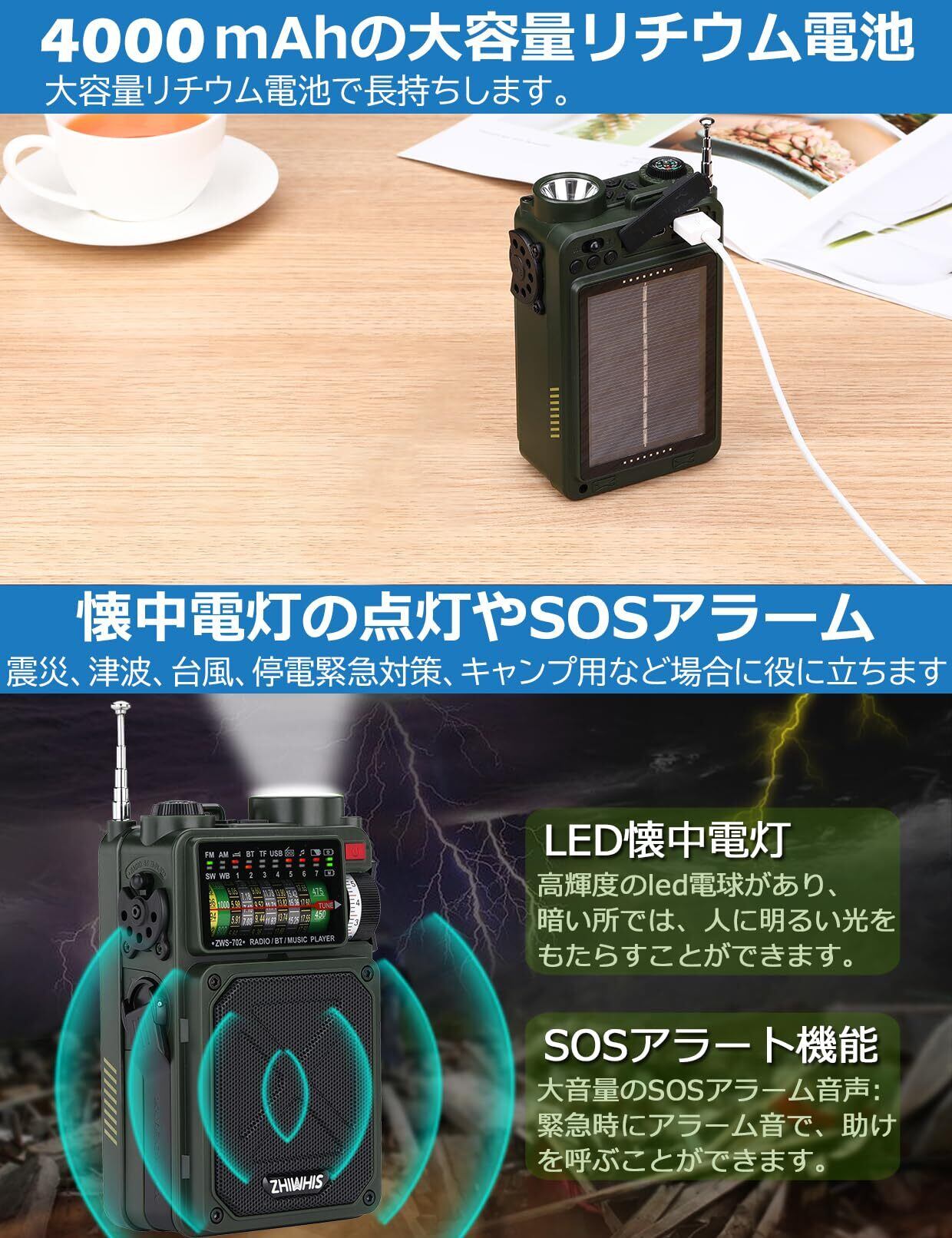 ZHIWHIS Bluetoothスピーカー 防災ラジオ FM/AM/短波/ワイドFM対応 懐中電灯 ソーラー/手回し/USB-C充電【SOSアラート/USB再生対応可能/MicroSDカード対応/32時間連続再生/タイマー/技適取得済 アウトドアZWS-702
