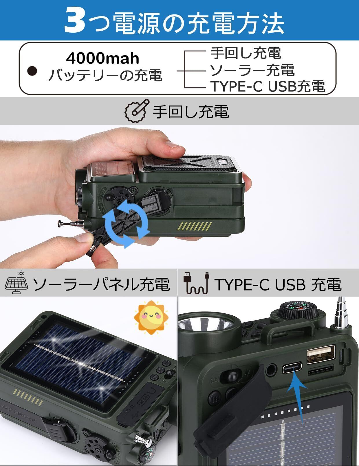 「USB-Cポート採用」充電式ラジオは内蔵の4000mAH大容量リチウム電池を備えております。ソーラー充電、手回し充電、USB-C充電の3つの充電方法があります。震災、津波、台風、停電緊急対策、キャンプ用、日常使用など場合に役に立ちます。