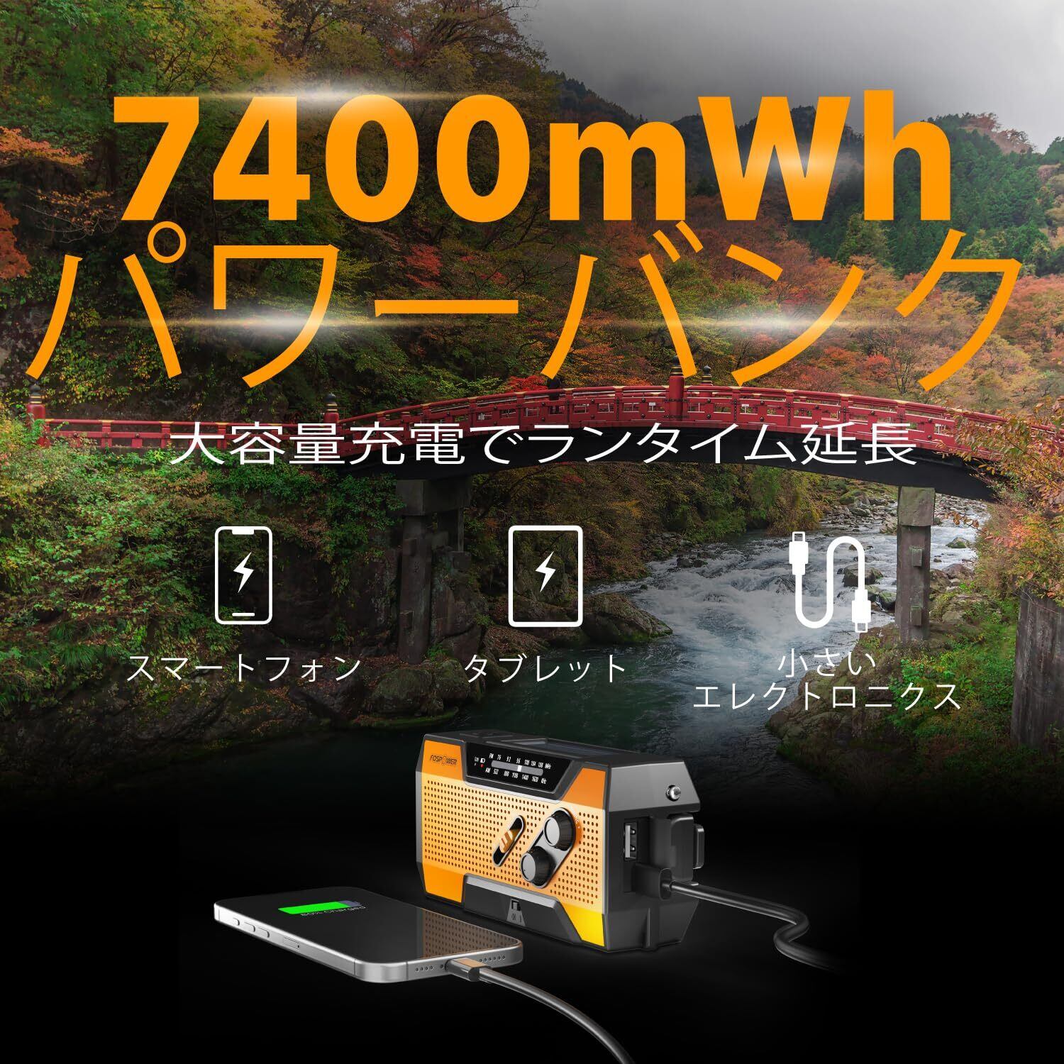 [7400mWh (2000mAh) のパワーバンクがデバイスの電源供給を維持します] FosPower FOSPWB-2376 緊急ラジオには、あらゆる小型タブレットや携帯電話に緊急電源を供給できる 7400mWh (2000mAh) のパワーバンクが組み込まれています。