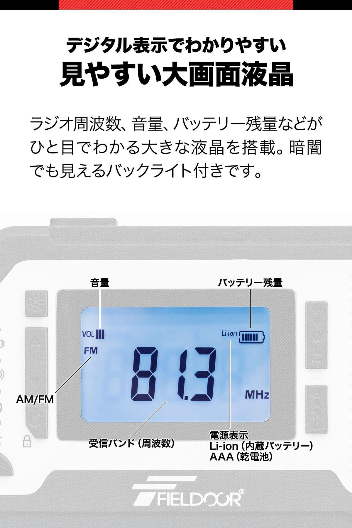 ■【災害時の安心を提供する多機能ラジオ!】FIELDOORの防災ラジオは、AM/FMラジオに加え、懐中電灯、SOSアラーム、スマホ充電機能を搭載した多機能アイテムです。震災や大雨、台風による停電時に必要な情報をしっかり受信し、非常時の安心感をサポートします。
