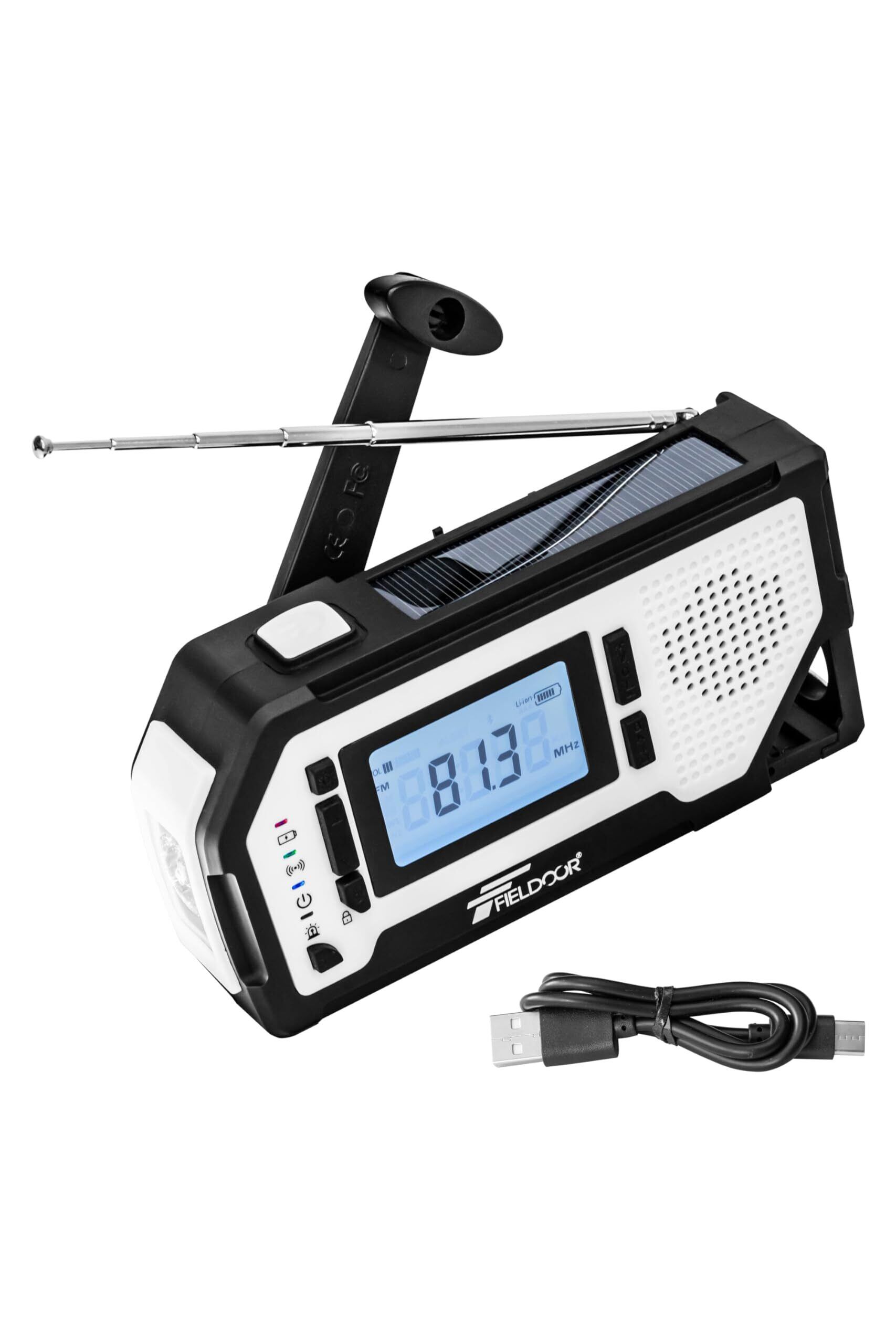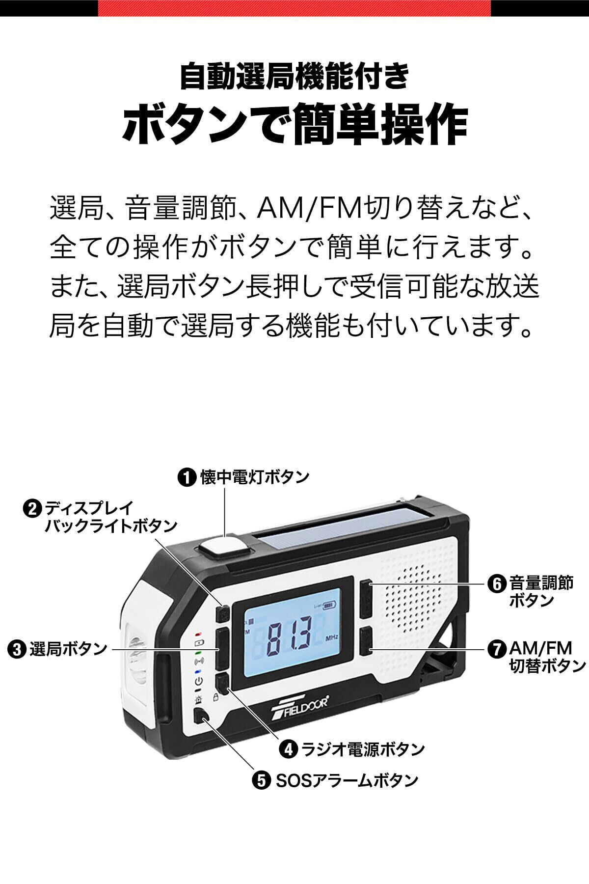 FIELDOOR 防災ラジオ 多機能 懐中電灯 USB充電 乾電池 スマホ充電 ソーラー 手回し モバイルバッテリー ソーラー充電 生活防水 AM/FM ラジオ LEDライト SOSアラーム 2000mAh イヤホン 防災 災害 ポータブル グッズ デジタル表示 カラビナ 栓抜き付き