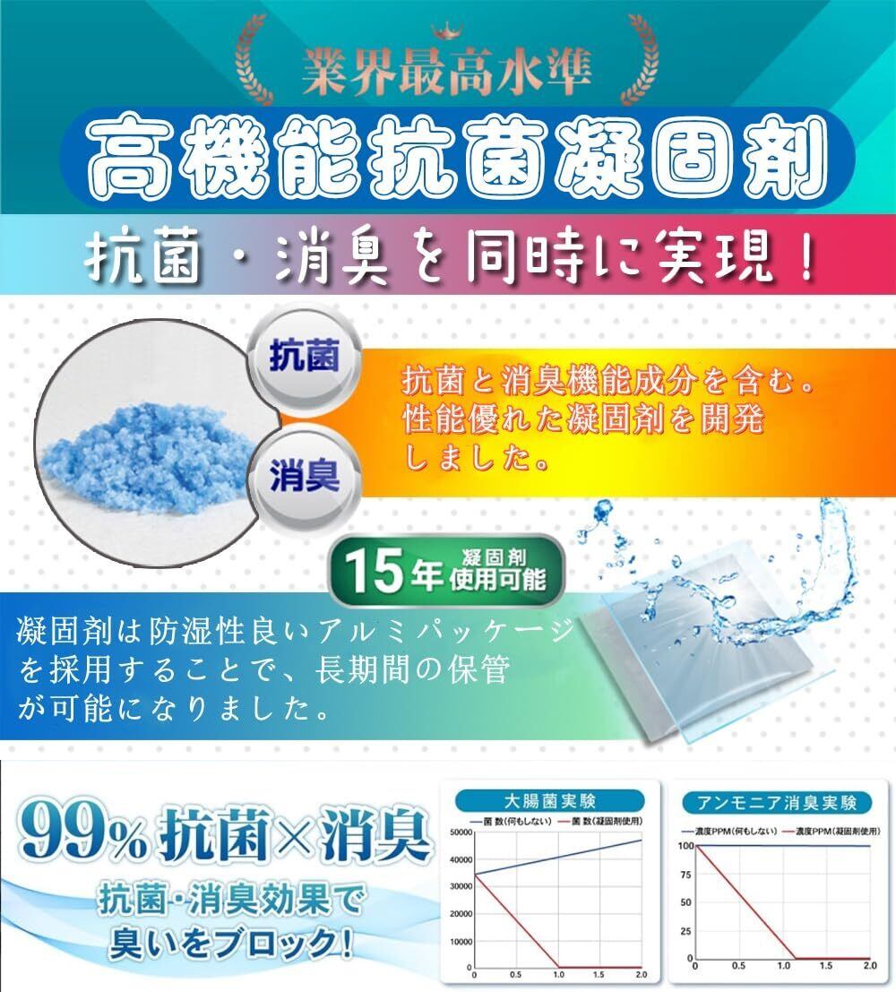 【15年長期保存可能、収納簡単】凝固剤は防湿性良いアルミパッケージを採用することで、長期間の保管が可能になりました。袋は優れたPE材質を採用、破れや漏れなどがにくいです。省スペース設計(約19X28X10cm)で本棚やトイレの収納ケースに置けばいいです。(※直射日光や高温多湿でのところを避けて保管してください。)