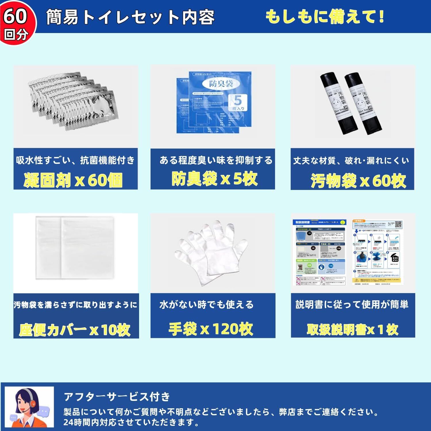 【災害用トイレセット内容】汚物袋x60枚、抗菌凝固剤x60回分、防臭袋x5枚、手袋x120枚。が24時間アフターサービスを提供しており、万が一商品不具合のようでしたら、の購入履歴より販売店までご連絡ください。