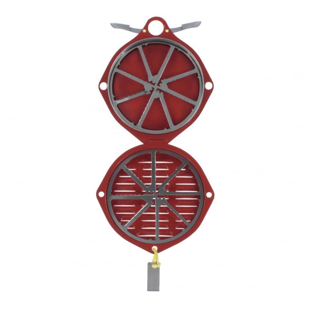 上下に付いたノコギリ状の刃で挟み込んで固定するものです。※ノコギリ刃で怪我のないように注意してください!