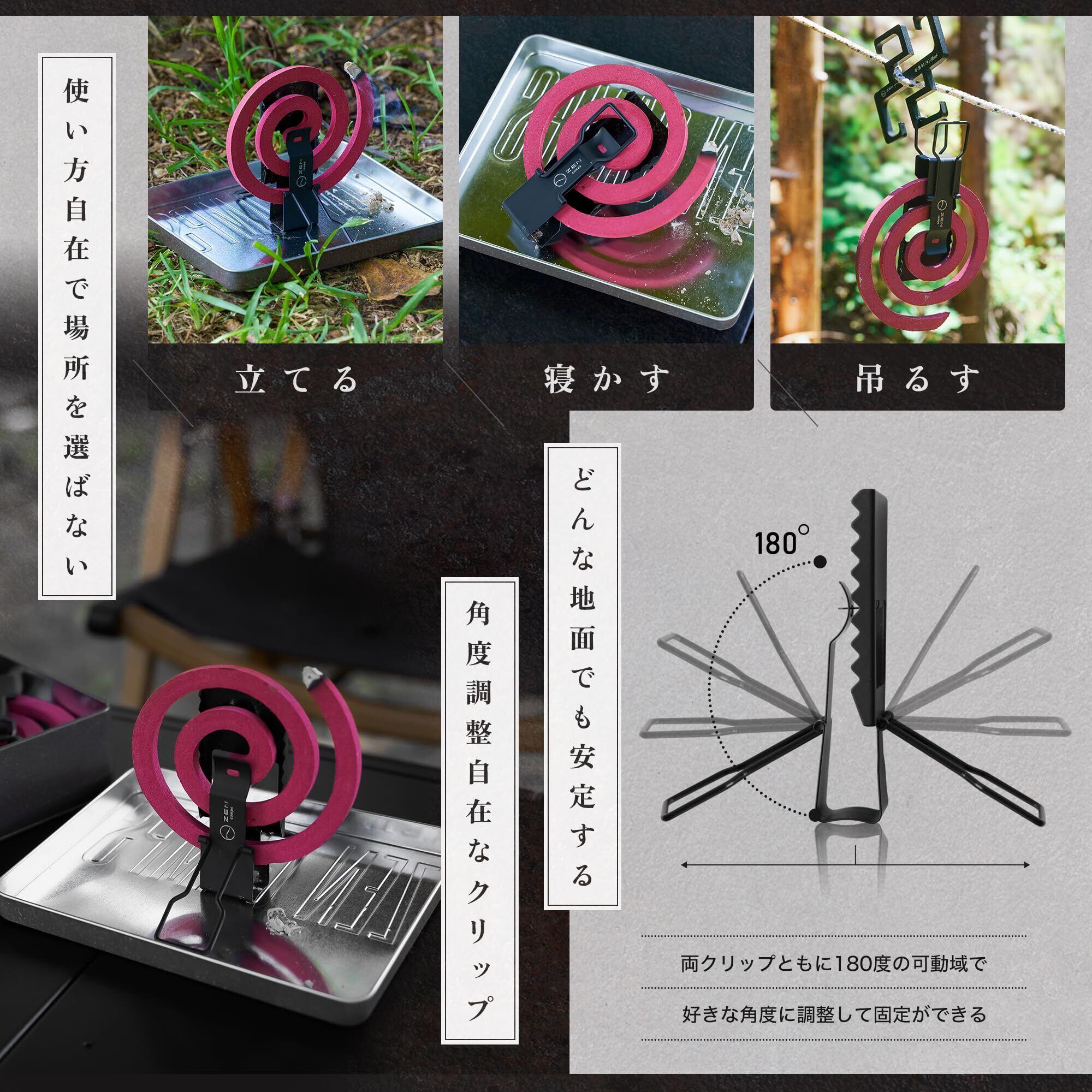 【機能性】蚊取り線香を装着して立てる、寝かす・吊るすことが可能で、色々なシーンで活躍します。蚊取り線香の火が途中で消えることなく最後まで使えます。