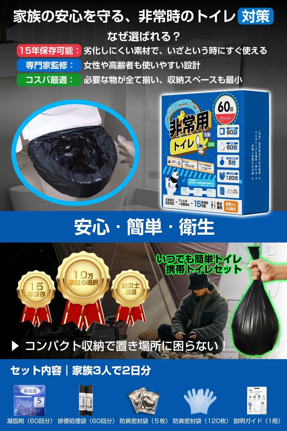 【15年保存可能な大容量60回分セット】酸化防止アルミシート内蔵包装により15年間の品質保持が可能。セット内容は凝固剤60回分・排便処理袋60枚・防臭密封袋5枚・手袋120組を同梱。大人3人分の2日間使用に最適な設計で、コンパクト収納袋(縦25cm×横18cm×厚さ5cm)で場所を選びません。