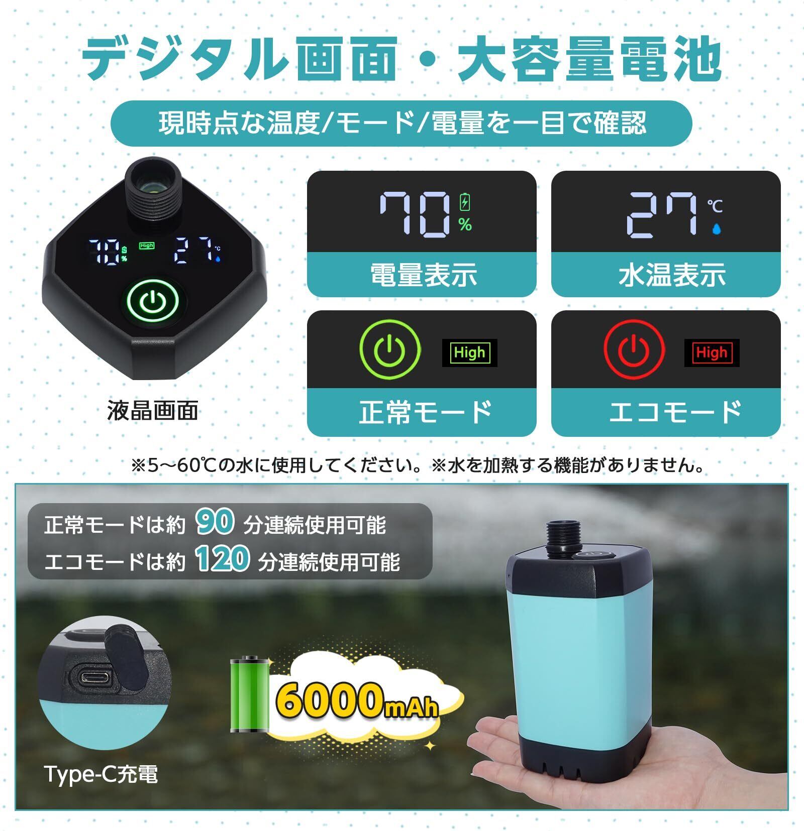 【コードレスUSB A-C充電式】他の携帯シャワーとは異なり、このポータブルシャワーはポンプと電源を1つにまとめ、スペースを節約するだけでなく、防水性能も向上させます。6000mAh大容量バッテリーが内蔵され、一回のフル充電で 正常モードは約90分連続使用可能、エコモードは約120分連続使用可能です。5V2AのUSBソケットを搭載するパソコン、モバイルバッテリー、ACコンセントに差し込むだけで充電できます。繰り返し使用できるUSB充電式は、乾電池を使用しなく、環境にやさしくて省エネです。【※水を加熱できません※】