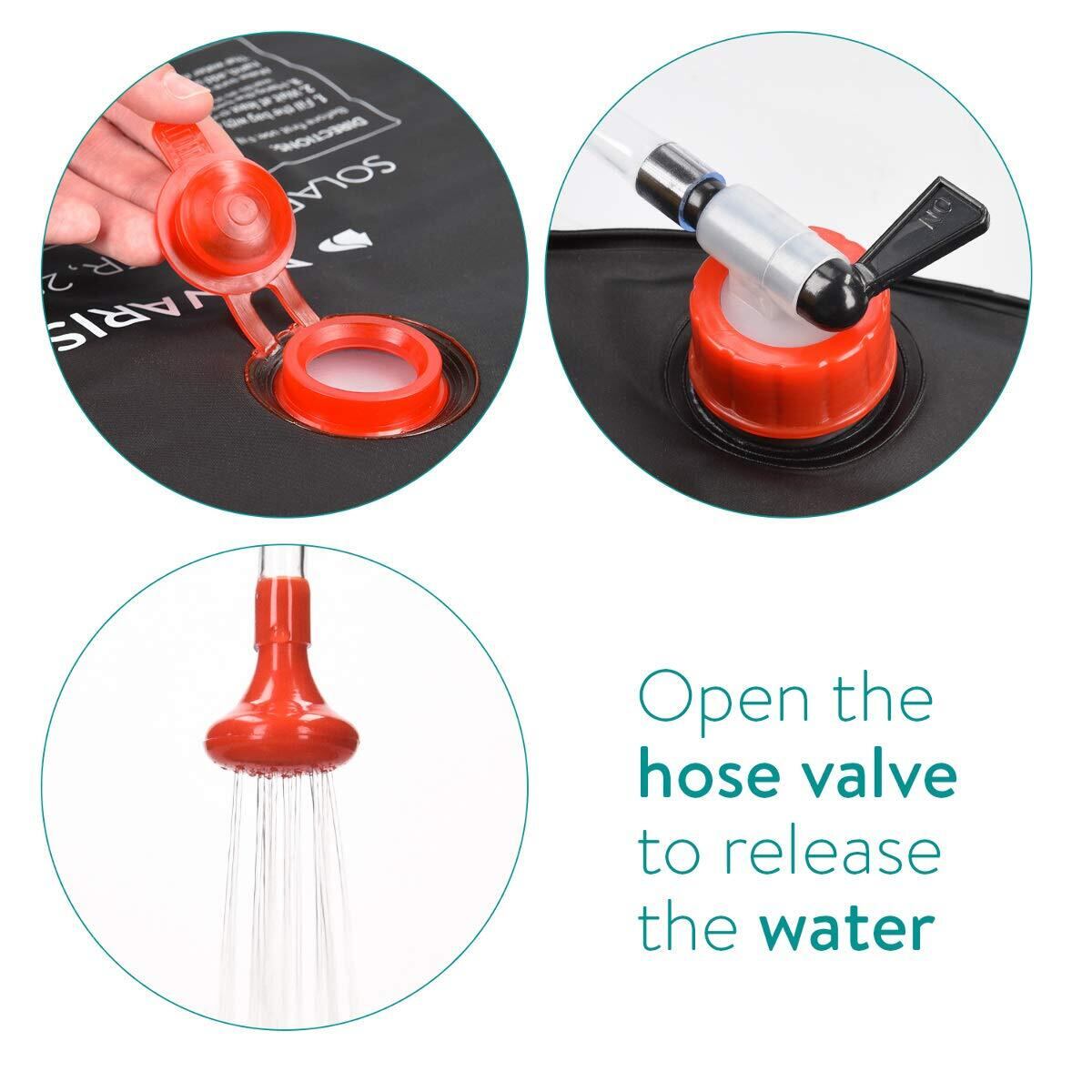 使用方法: ウォータータンクの中に水を入れ、黒い面を太陽光に当て、水が温まるまで3時間程待ちます。丈夫な柱や木などにシャワーバックを吊るし、バルブを開くとホースから水が出ます。使用前には必ず水温を確認し、熱すぎる場合はお好みで冷水を足してください。