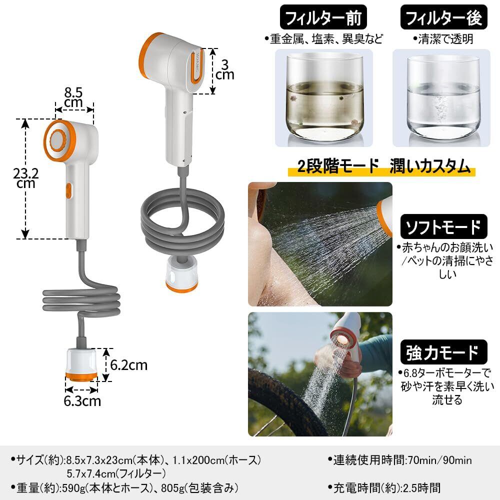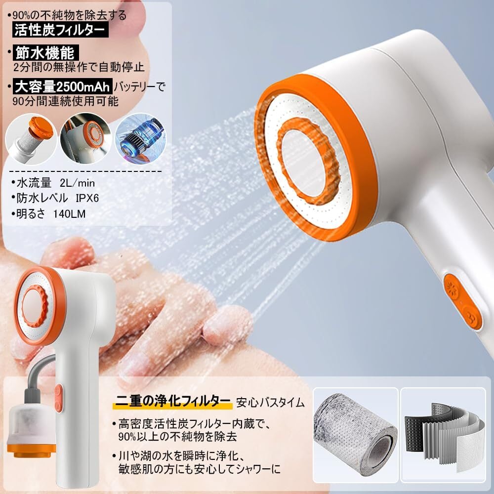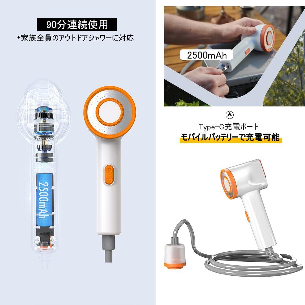 大容量バッテリー:2500mAhの大容量リチウムイオン充電電池と内蔵されており、電池を交換することが要らなくて何度も繰り返し充電可能、連続使用時間がソフトモード70分間、強力モード90分間まで、家族全員のアウトドアシャワーに対応可能です。