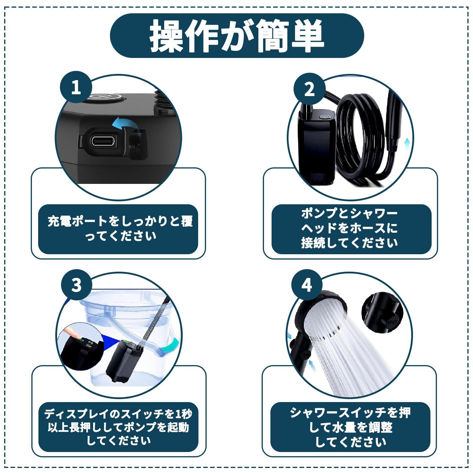 【調整可能なシャワーモード】【強力シャワーヘッド】当社のポータブルアウトドアキャンプシャワーヘッドには、水節約のための調整可能な水出力と、4つの実用的なシャワー設定が搭載されています。お好みのモードに簡単に切り替えることができます。【多機能】【フィルターシャワーヘッド】このキャンプシャワーポンプはPP素材を採用し、水中の不純物を除去し、シャワー後の肌トラブルを解決します。室内/屋外シャワー、キャンプ、ハイキング、ペットの清掃に効果的なソリューションを提供します。