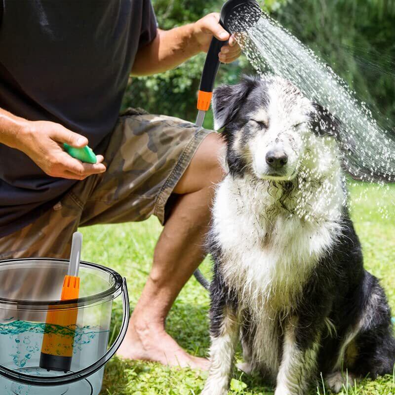 ■【電動で簡単操作!】この電動シャワーは、バケツの水を瞬時に柔らかなシャワー流に変換します。電源やバッテリーの心配がなく、簡単に使用できるので、どなたでも手軽にご利用いただけます。特に、アウトドアでの気になる汗や汚れをすっきり洗い流すのに最適です。