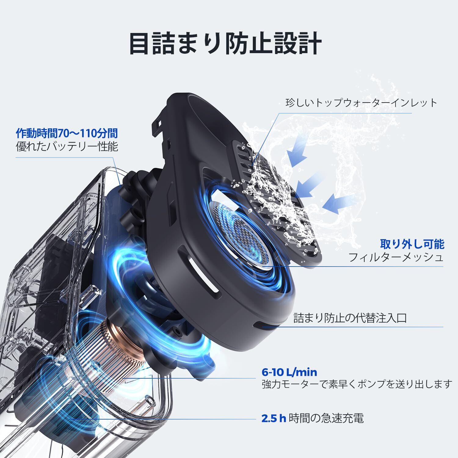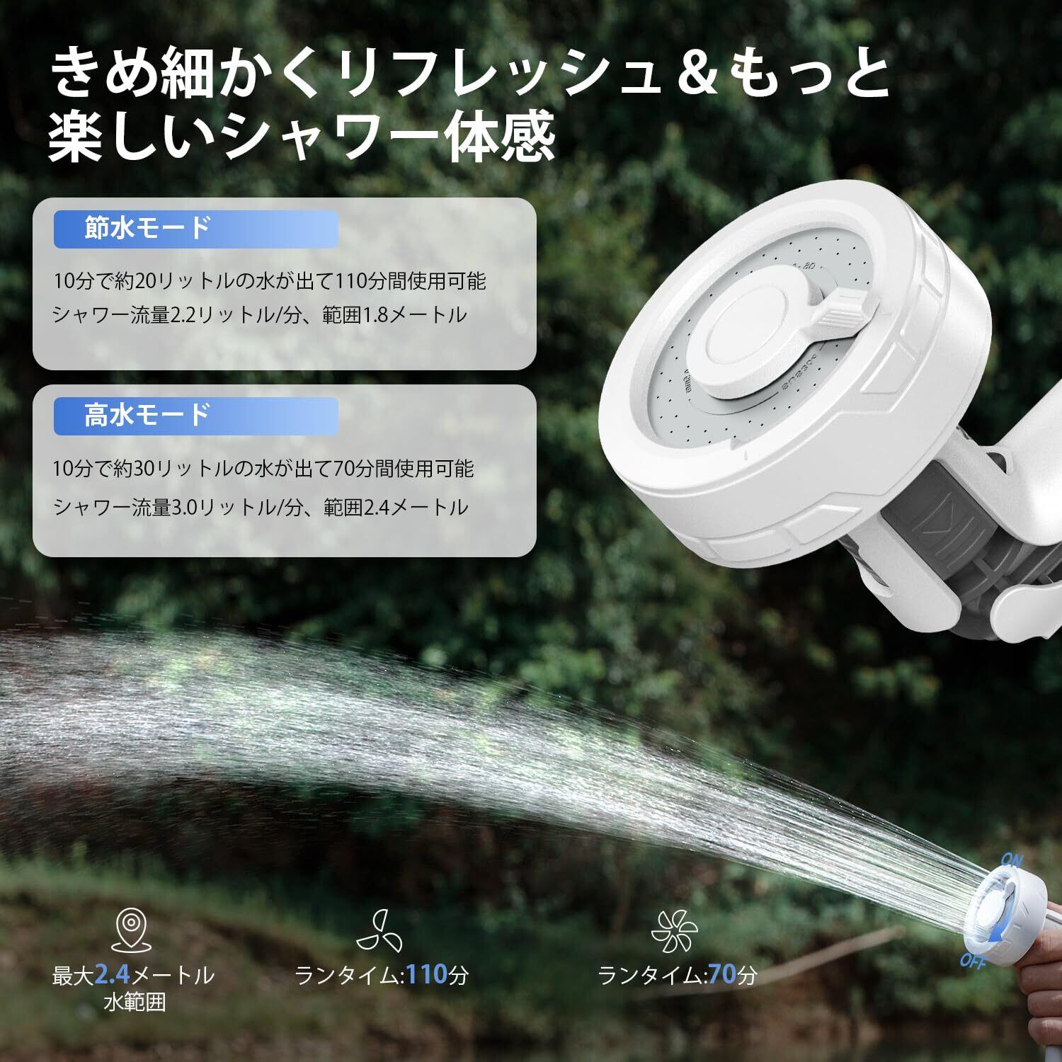 【急速充電】このシャワーポンプのバッテリーは最大18.5Whです。充電にはわずか 2.5 時間しかかからず、最大 110 分のバッテリー寿命が得られます。ご家族がシャワーを最大限に楽しむことができます。