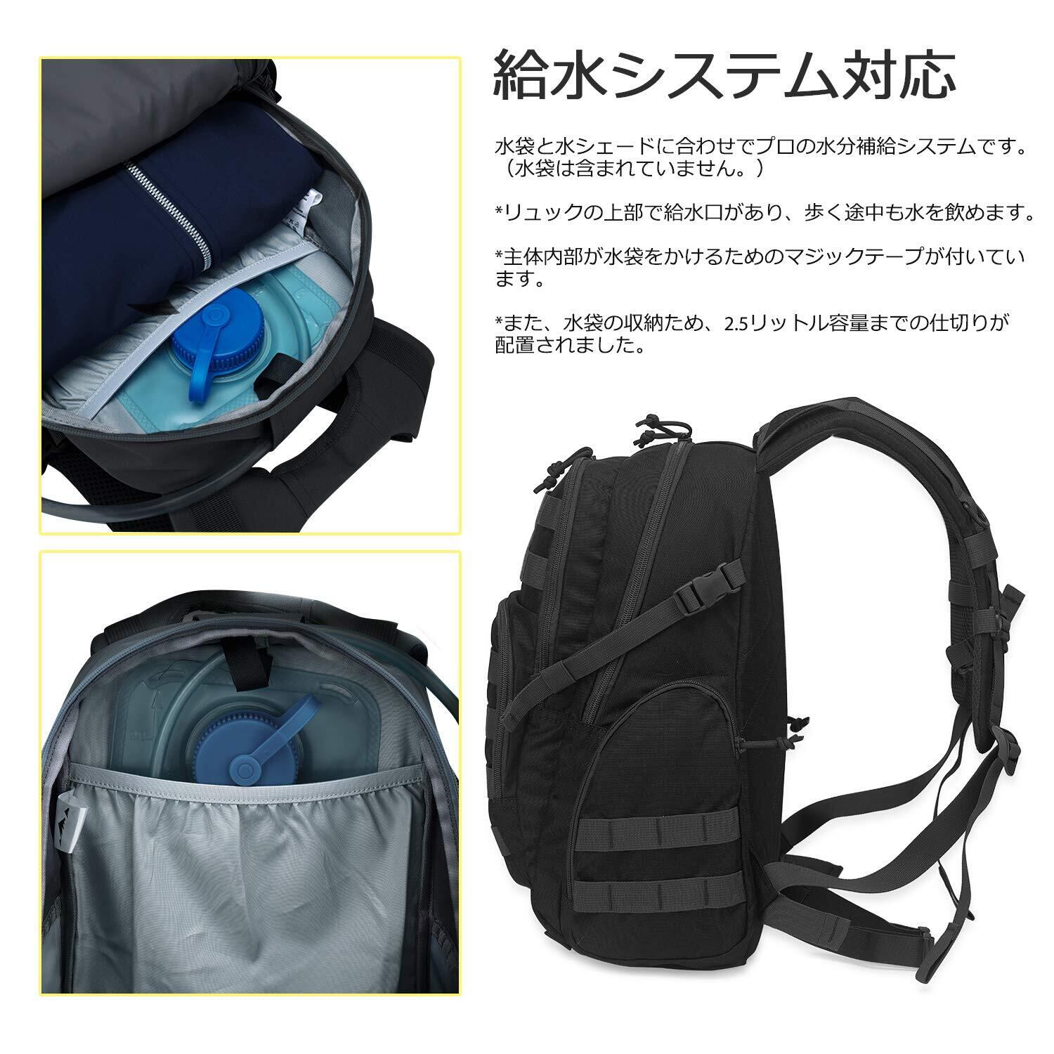 【MOLLE対応です】このリュックサックは、小さなアイテムに掛けたり、追加のポーチやギアを取り付けたりできます。 バックパックには、ベッドロール、テント、またはその他のものをストラップするための4つのmolleフックも下にあります。 サイドポーチはウォーターボトルにフィットします。