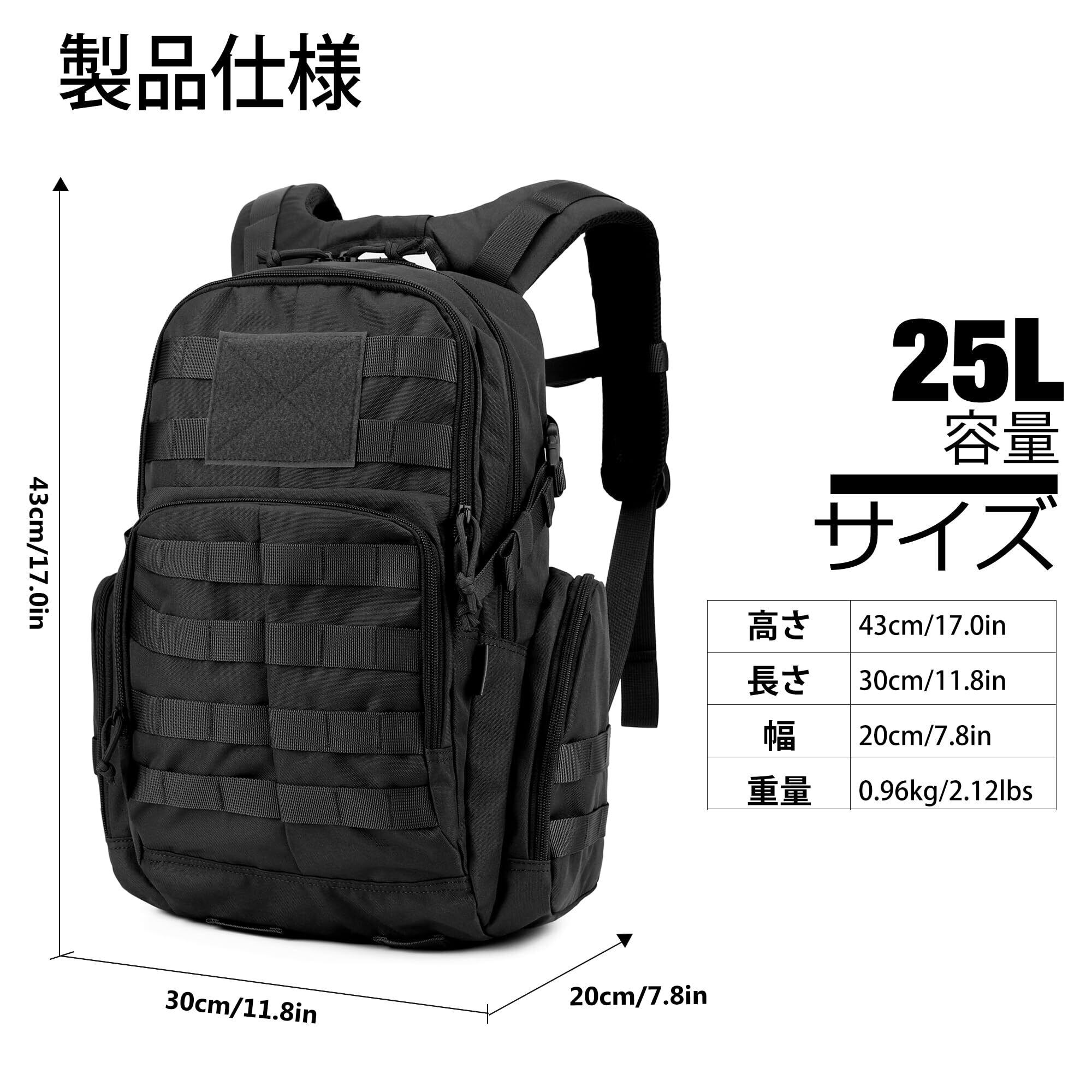 【リュック仕様】容量:25L。長30x高43x幅20cm。このミリタリーバックパックは600D耐水性ポリエステルで作られています。 YKKジッパー。