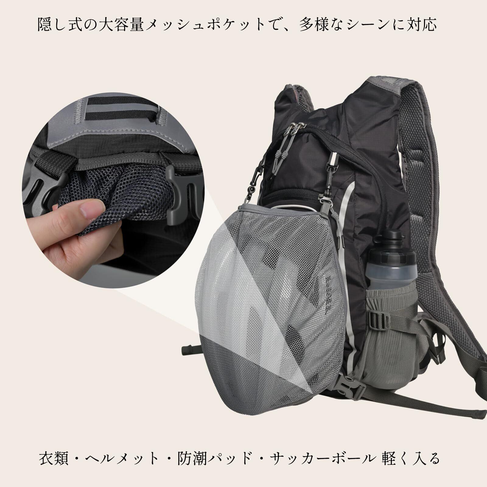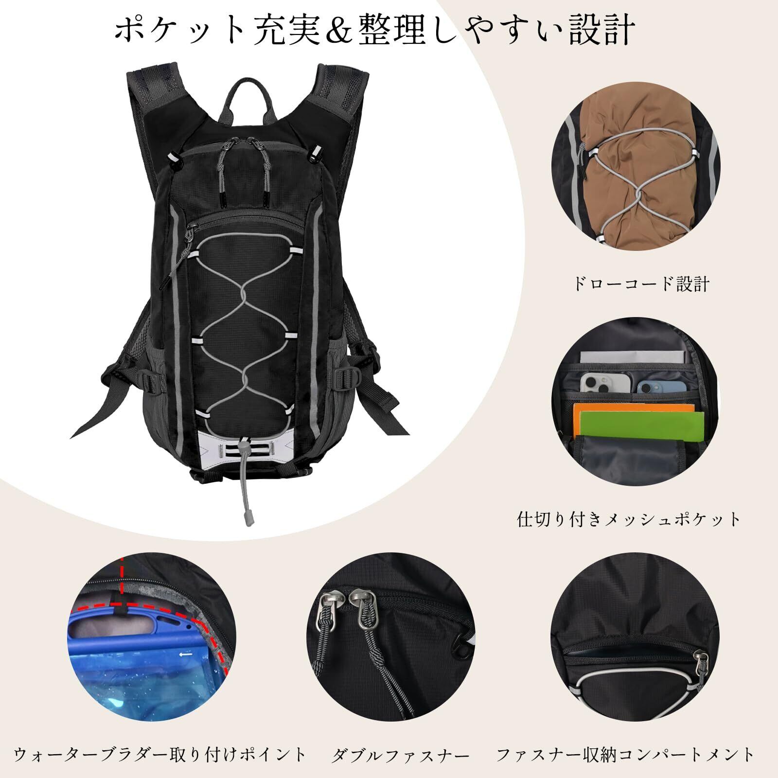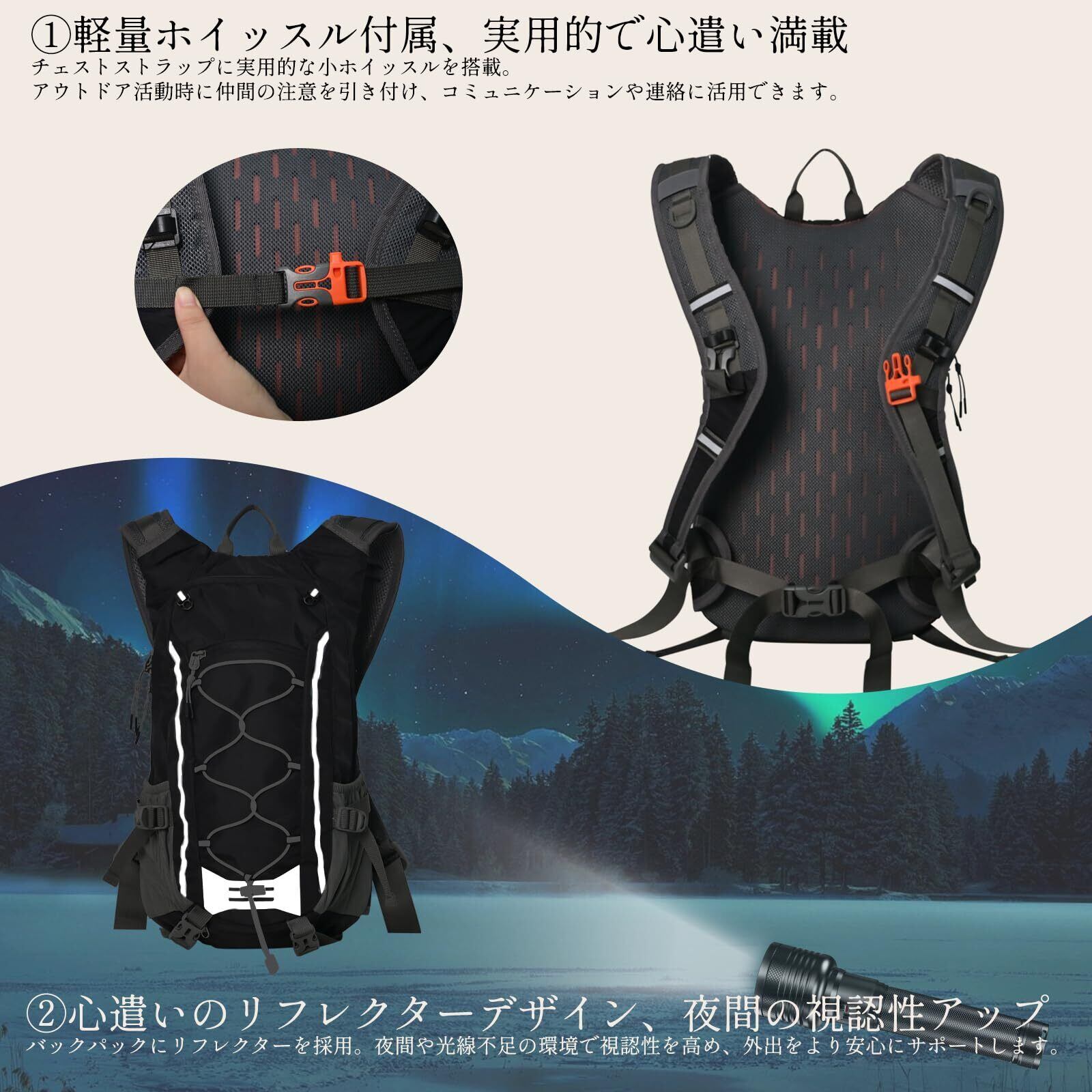 【細やかな使い勝手設計】リュックの前面には反射テープを採用し、夜間の登山やサイクリング時にも視認性を確保。水袋倉設計が搭載されており、アウトドア時の水分補給に便利です。隠し式ネットポケットにはヘルメットや外套を収納でき、使い勝手が大幅に向上。緊急事態に備え、ホイッスル付きチェストベルトを搭載しており、安心感を高めています