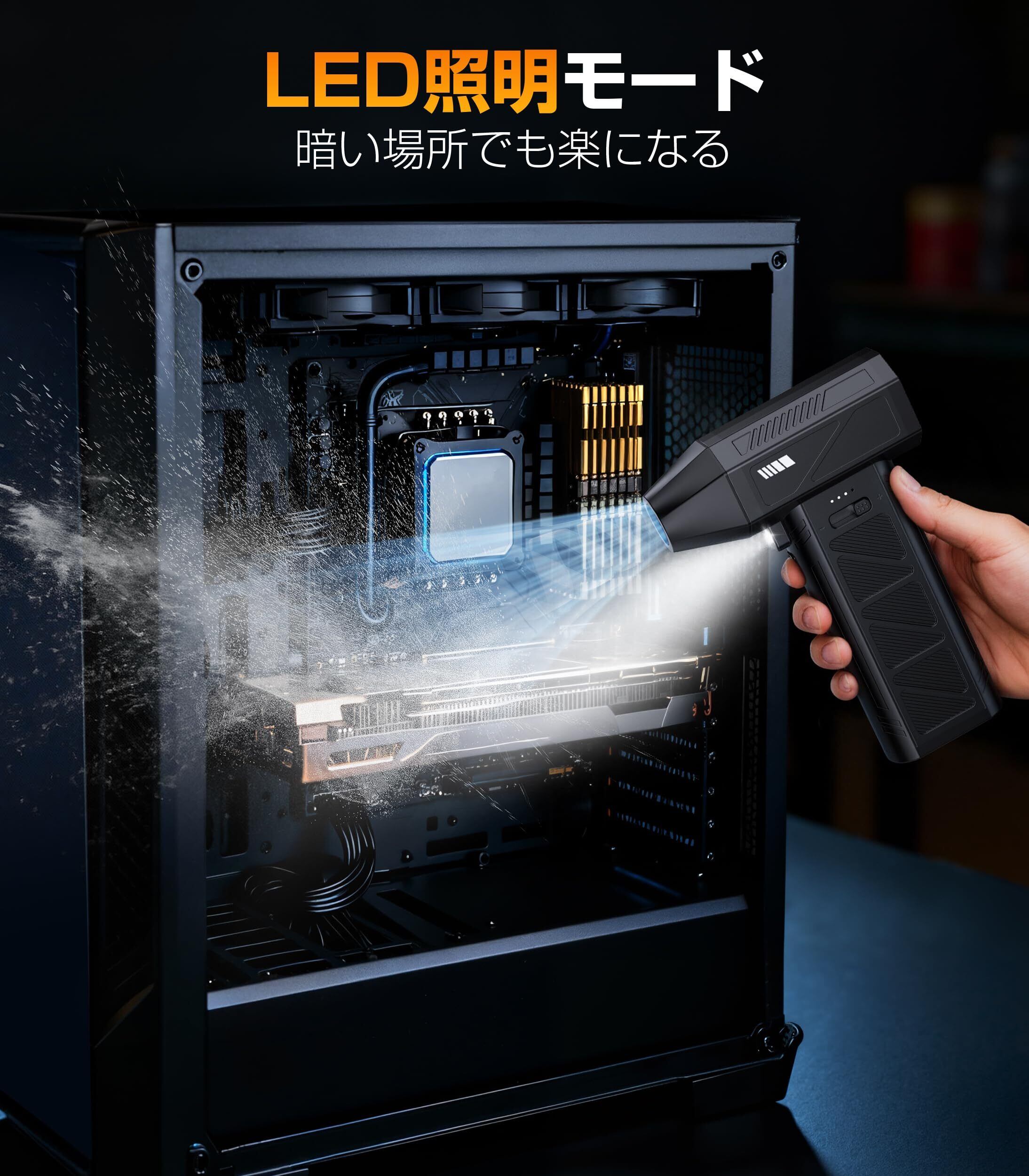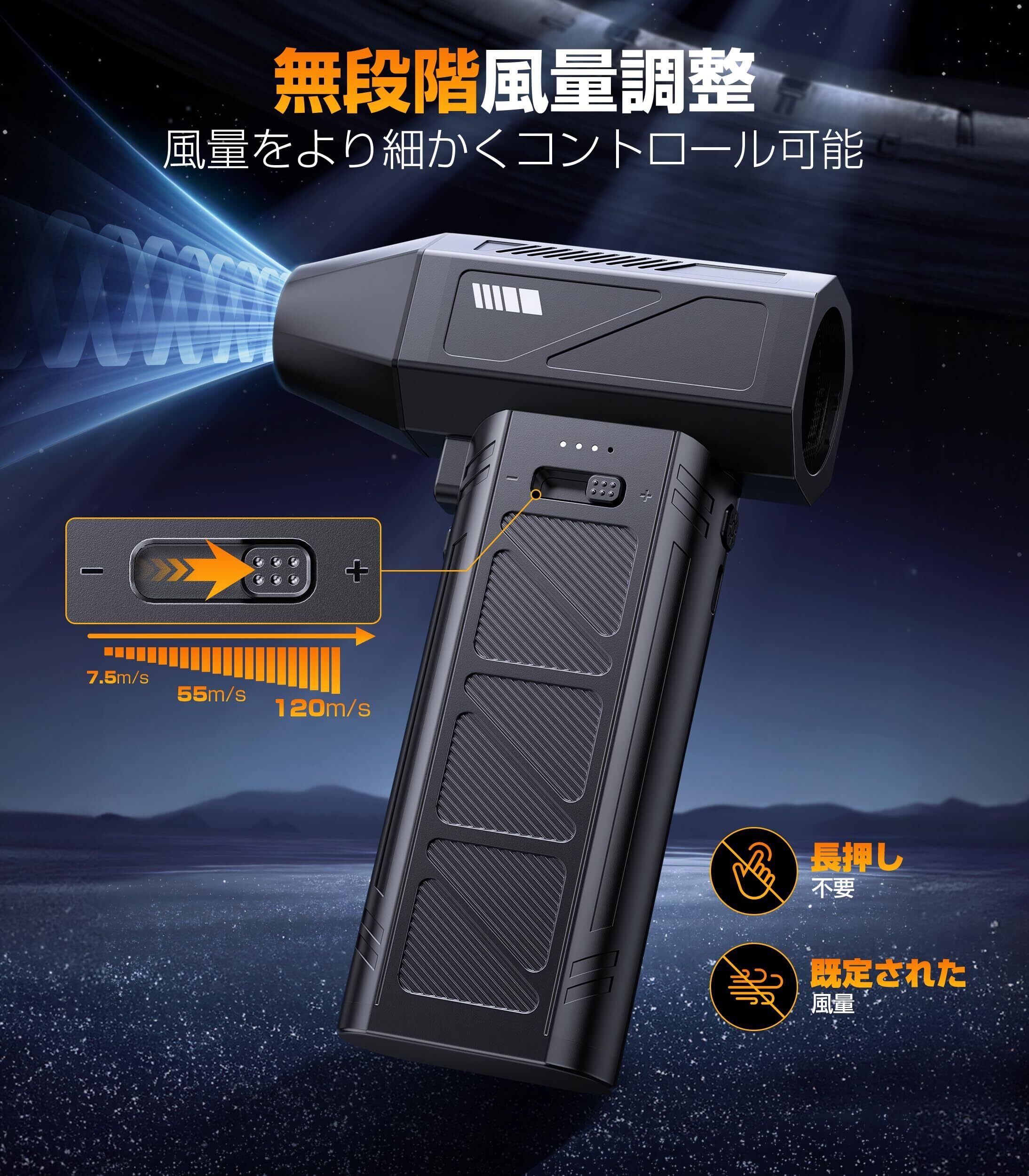 エアダスター 電動エアダスター ブロワー 小型 ブロアー 180000RPM高速回転 強力 最大風速120m/s 無段階風量調整 5種類ノズル付き LEDライト付き Type-C充電式 PC掃除/エアコン/キーボード/車内/洗車用/照明等 収納ボックス 日本語取扱説明書付き (ブラック)