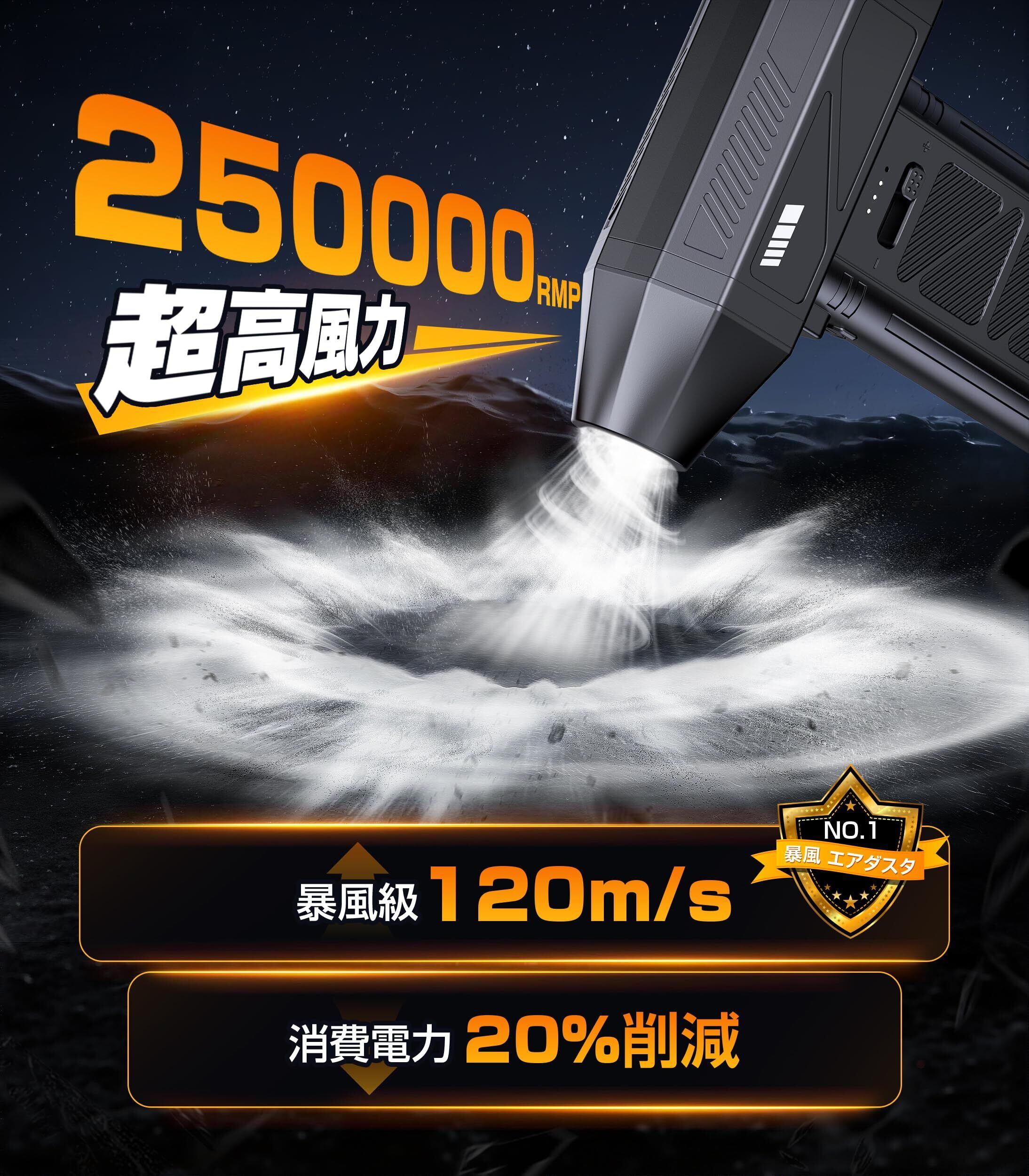 【風速120m/s、250000RPM&超強力噴射】業界初のダブルタービンファン技術を採用したこのエアダスターは、風量が2倍!超高速ブラシレスモーター搭載、風速120m/s、最大回転数250,000RPMを誇り、従来の製品と比較して圧倒的な風力を実現。強力なエアフローで、ホコリやゴミ、砂ぼこりを瞬時に吹き飛ばし、ピンポイントで効率的に清掃できます。