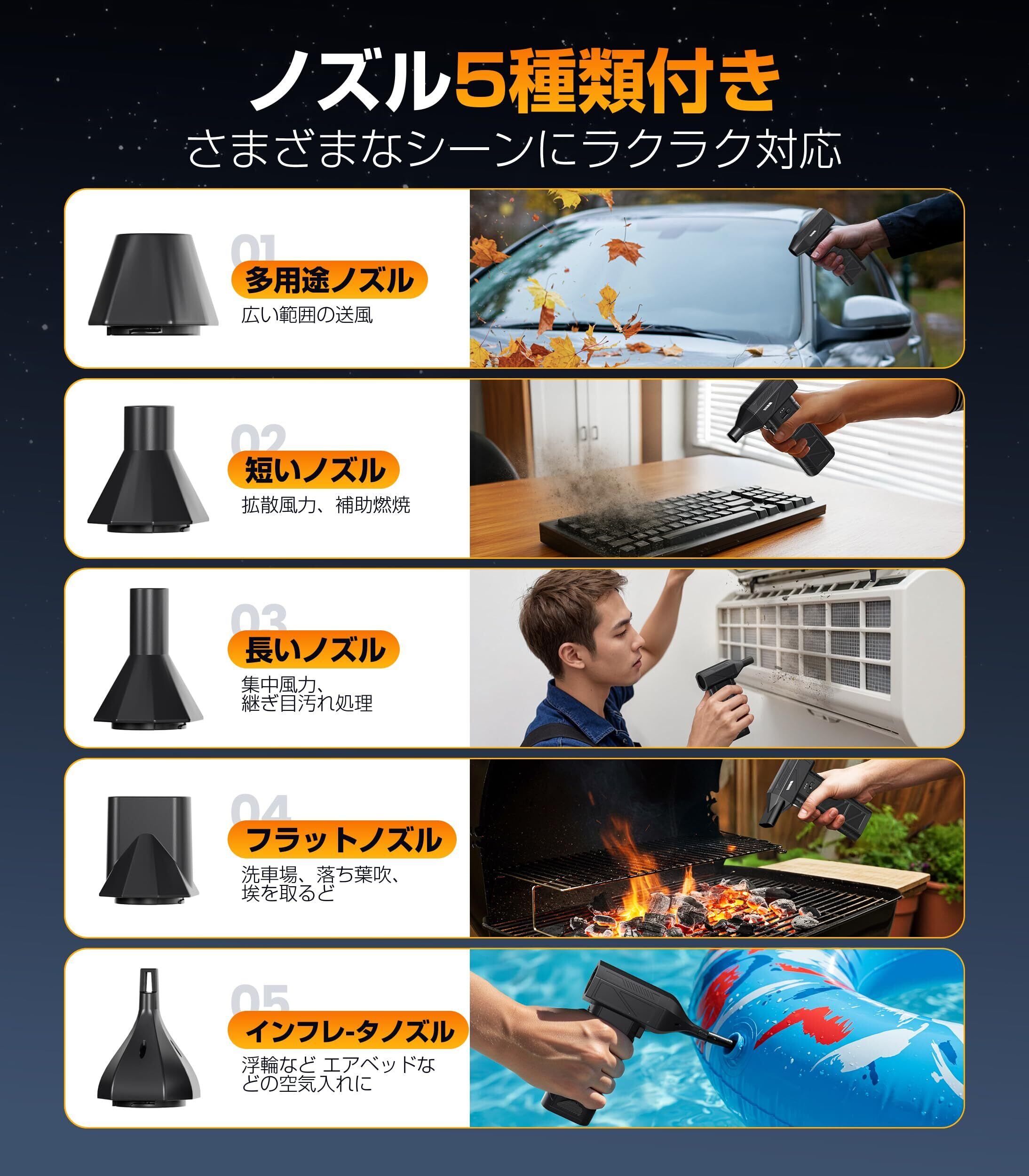 【5種類のノズル&使いやすさ】多用途ノズル*1、短いノズル *1、長いノズル *1、フラットノズル*1、インフレーターノズル*1。電動エアダスターは、キーボードの隙間やPC周り、デスク周り、エアコン、火起こし道具、車内、窓のサッシ、掃除機のフィルター、浮き輪の空気入れ、洗車後の乾燥など、様々な場所で活躍します。
