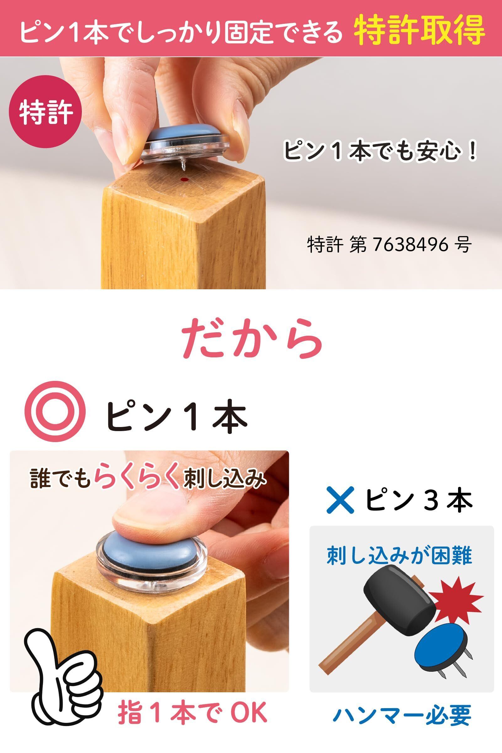 【ぷちっとアンカーでしっかり固定】 第7638496号の固定技術により、椅子脚に強固に食いつき取れにくい構造になっています。 両面テープのみの取付に比べて3.5倍の取付強度になっています。取付け易くしかもしっかり取り付くことにこだわり、数多くの試作を繰り返した結果、短い1本釘を採用しました。