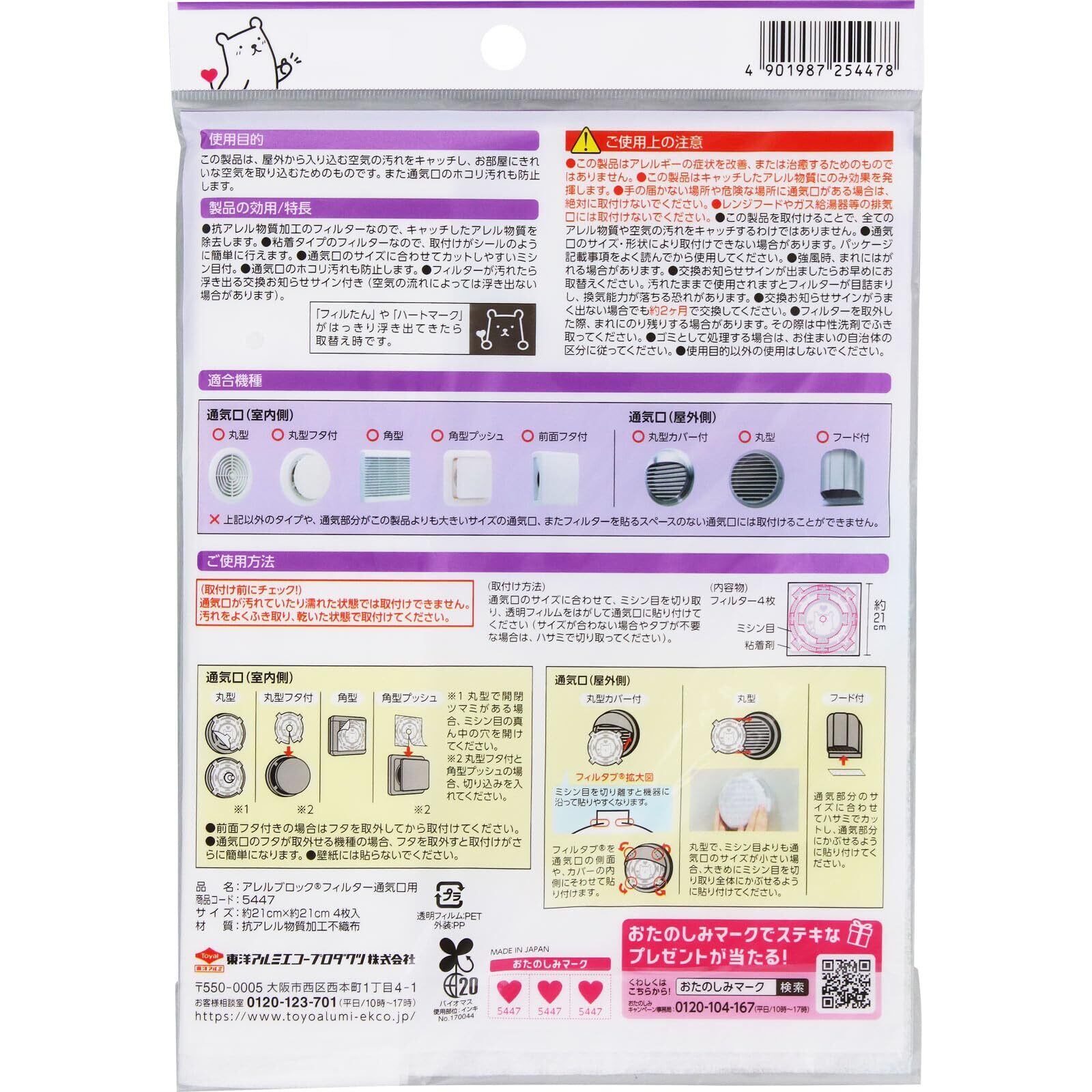 東洋アルミ アレルブロック通気口フィルター 約21cm×21cm 4枚入 室内・屋外用 貼るだけ 花粉 虫対策 お掃除を簡単に フィルたん 換気扇 S5447