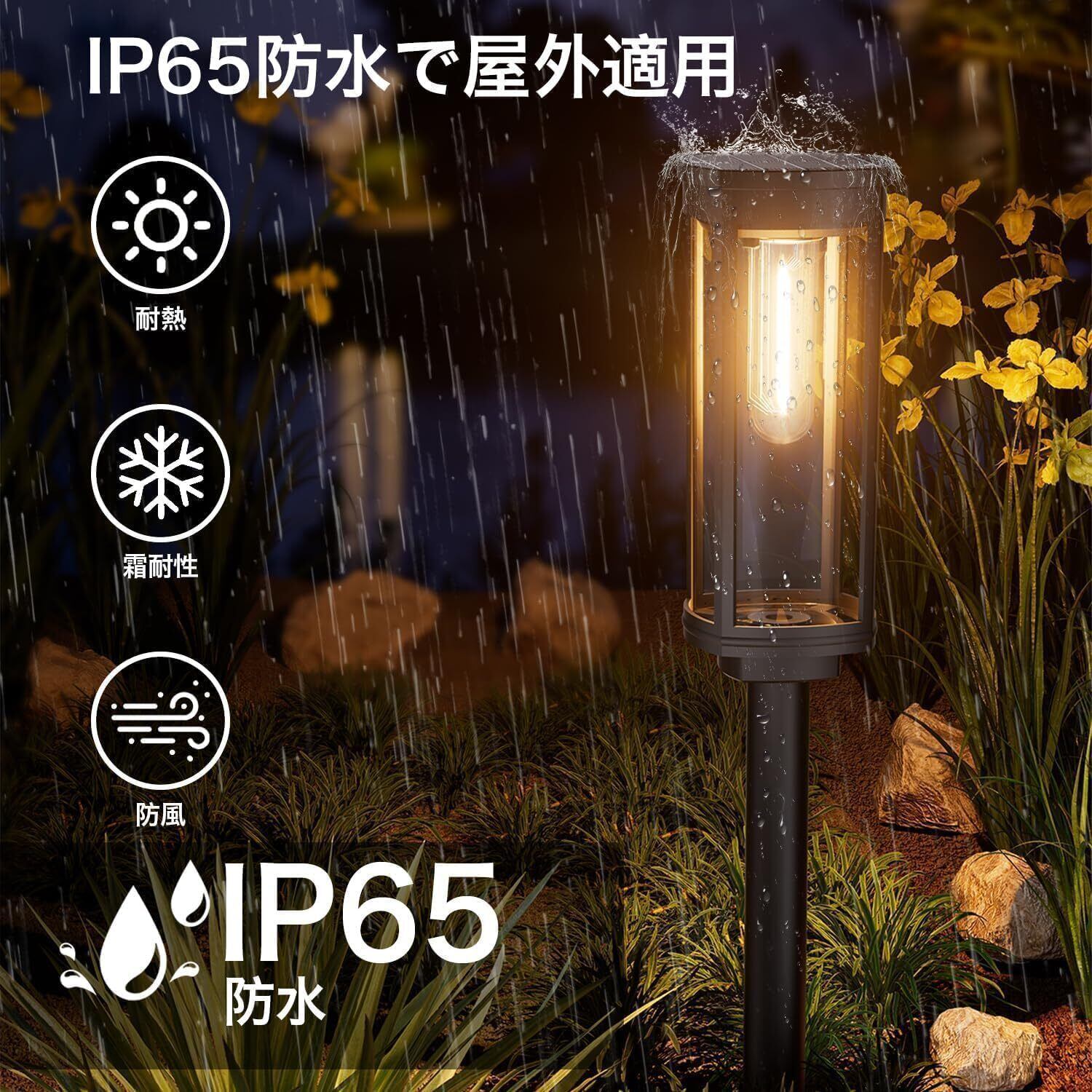 【IP65防水、四季耐候】 本庭ライトは丈夫なABS製ブラケットとスパイクを採用し、一体型シーリング設計で防護等級IP65。約-20℃~60℃の環境で安定動作し、雨、酷暑、寒波、砂塵に対応します。長時間の水没は避け、パネルは定期的に拭き取ってください。