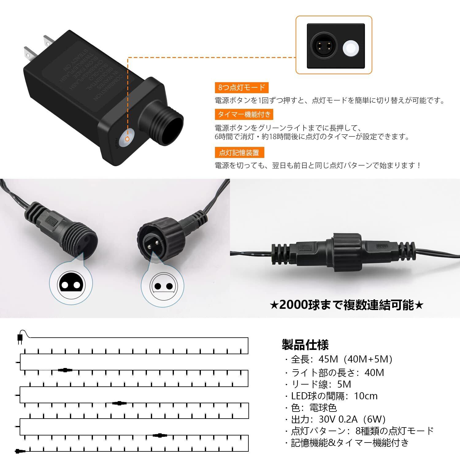 【業務用に最適の連結機能】オス、メスのプラグをつないでキャップを締めるだけで簡単に接続できます。同商品との連結も可能で、「ライトの長さが短い」「コンセントが足りない」など、飾り付けの”困った”を即解決するよ! 連結機能を使いこなして、より快適にイルミネーションを楽しみましょう。連結には、連結タイプごとに連結できる電気容量の制限があります。そのため、ライト同士を複数連結する際には、連結するライト全体での消費電力(W)を確認する必要があります。最大2000LEDまで連結可能です