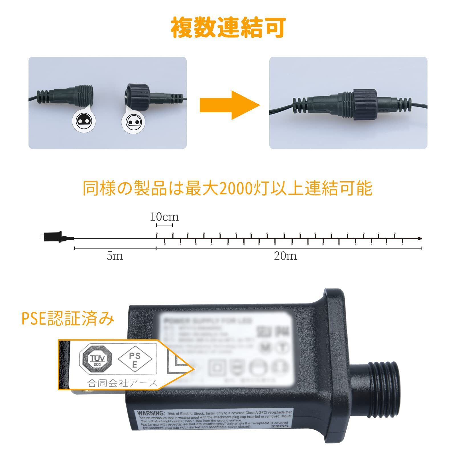 【2000灯までも連結可能・PSE認証済み】このled イルミネーション ライトは日本の電気安全法に基づく技術基準に適合しますので、ご安心にお使いください。またストレート イルミネーションライトはACコンセントから取り外しも可能で、同じ製品を複数連結してもピカピカに点灯できます。それで、業務用の装飾ストリングライトとして最適です。※ご注意:1000灯以上に連結すれば、ライトは少し暗くなりますので、ご了承ください。