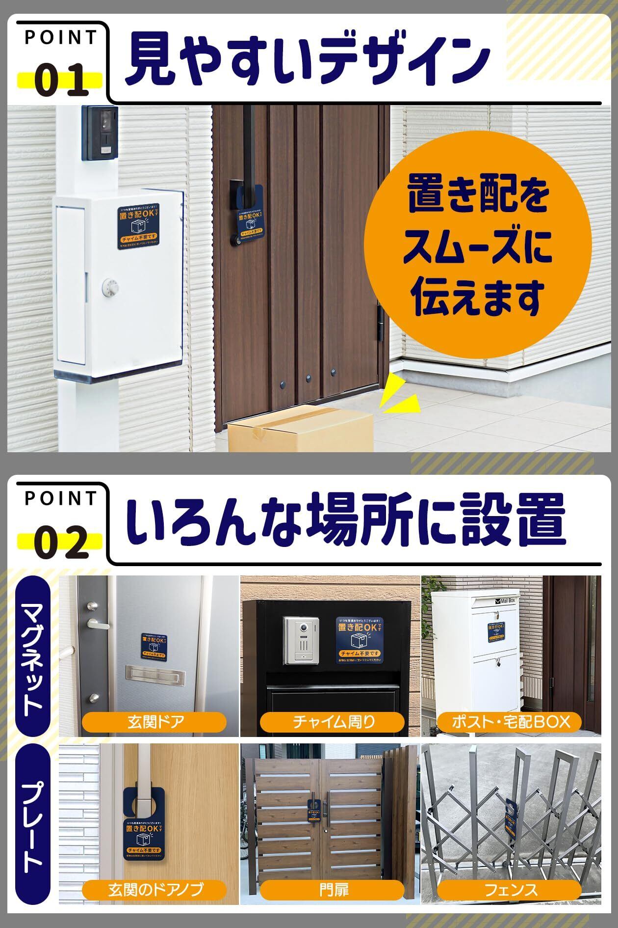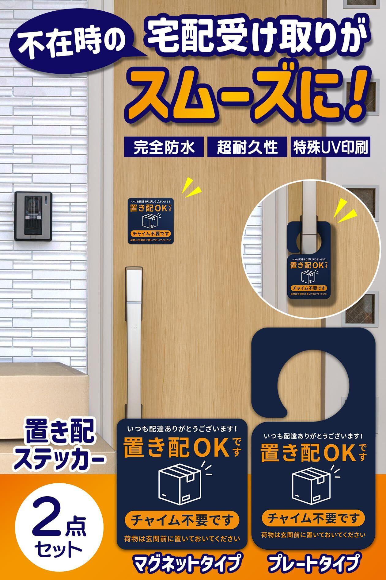 【高耐久で高コスパ!スマートな置き配対策】置き配ステッカー プレート 2点セット マグネット 特殊UV加工 防水 高耐候性 置き配ボックス 宅配ボックス 置き配OK チャイム不要 不在時 玄関前に 屋外