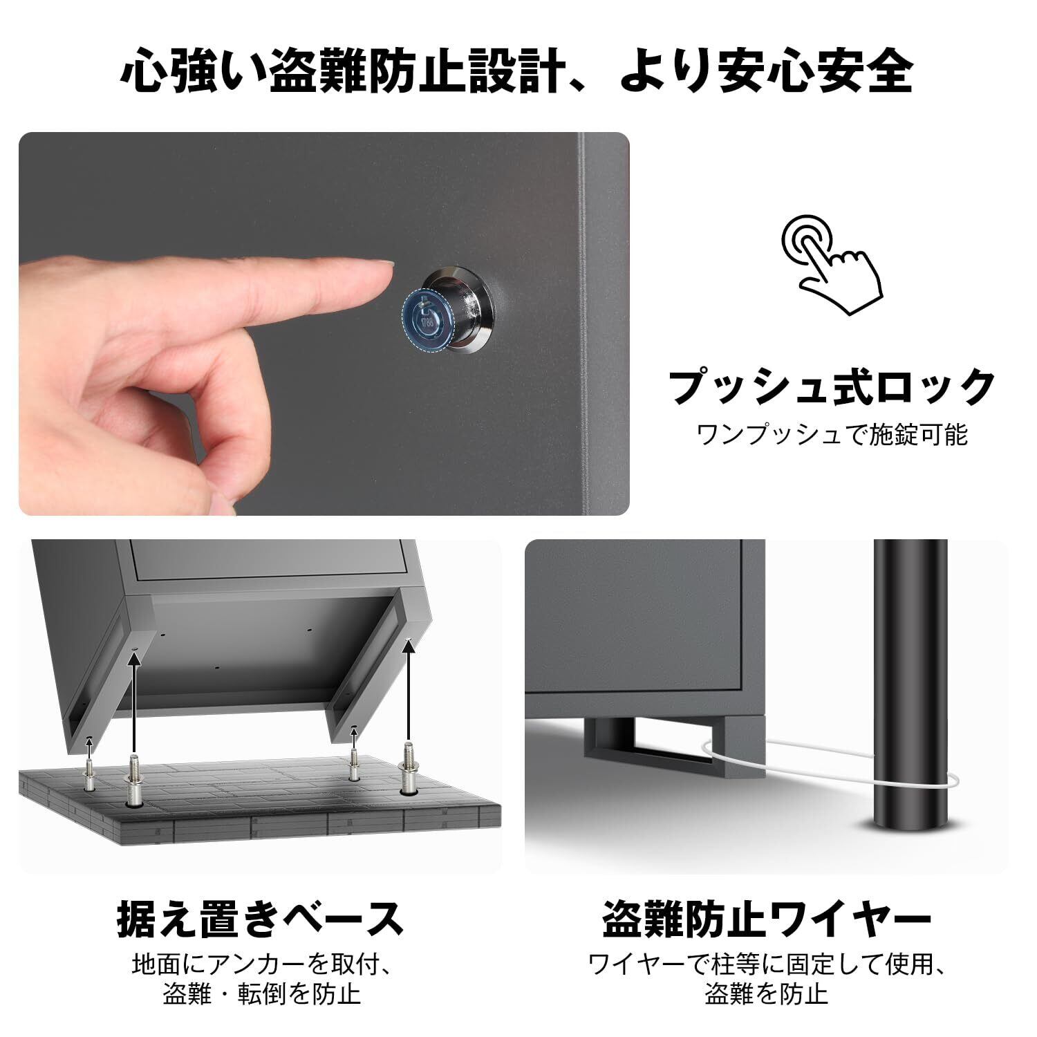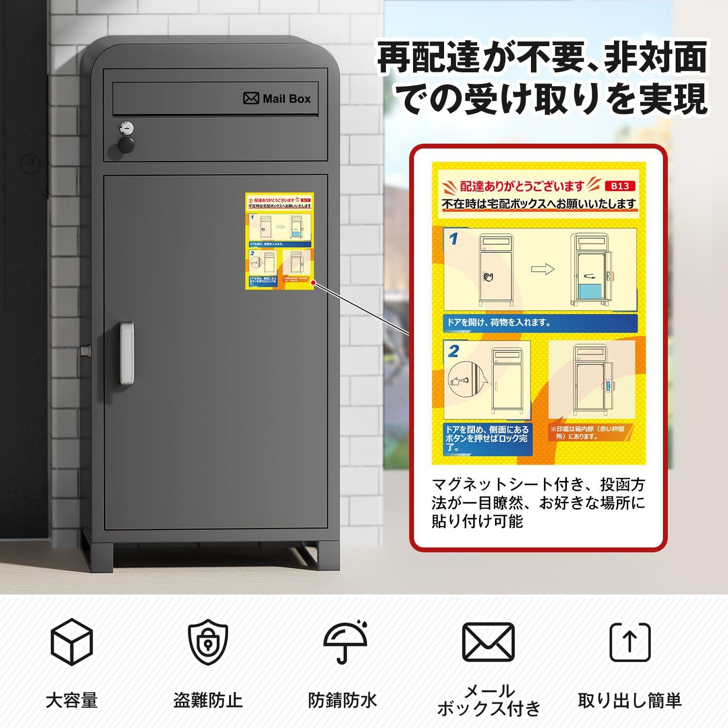 【操作簡単】郵便受け付きの宅配ボックスは組み立て不要で届いてすぐに使用でき、必要に応じてアンカーセットとワイヤーを取り付け、盗難を防止します。雑誌、郵便物などの小型郵便物はメールボックスから投函可能で、下側のメイン扉は大きめの荷物を受け取れるスペースを確保できます。さらに、案内用のマグネットシート付きで、配達員が見やすいところに貼り付ければ、投函方法が一目瞭然、配達作業もスムーズに行われます。