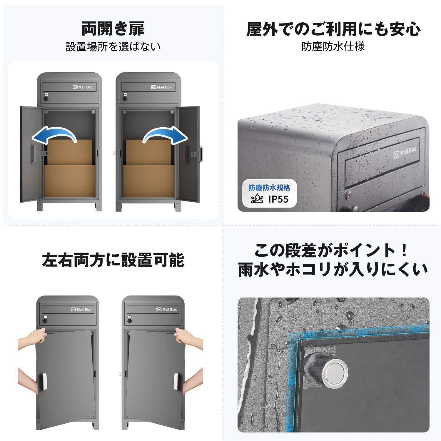 【高品質・防水防錆】箱全体に亜鉛メッキを施し、丈夫で防錆性に優れております。IP55の防水構造を採用することで、雨水の侵入や腐食を防ぎます。それに、宅配BOX内部に水排出穴があり、不用意に入った液体を排出でき、大切な荷物をしっかりと保護します。屋外でもより長くご利用頂けます。
