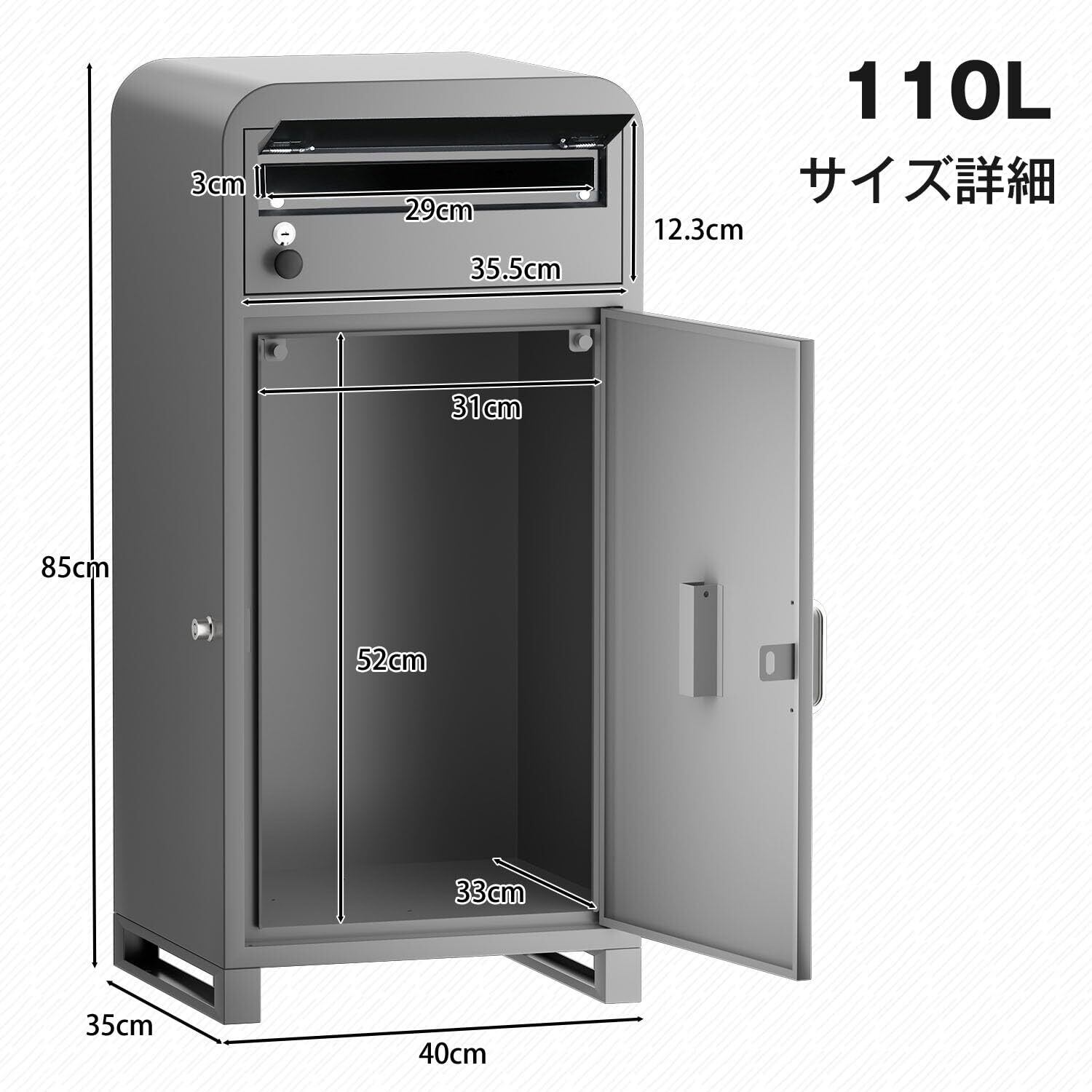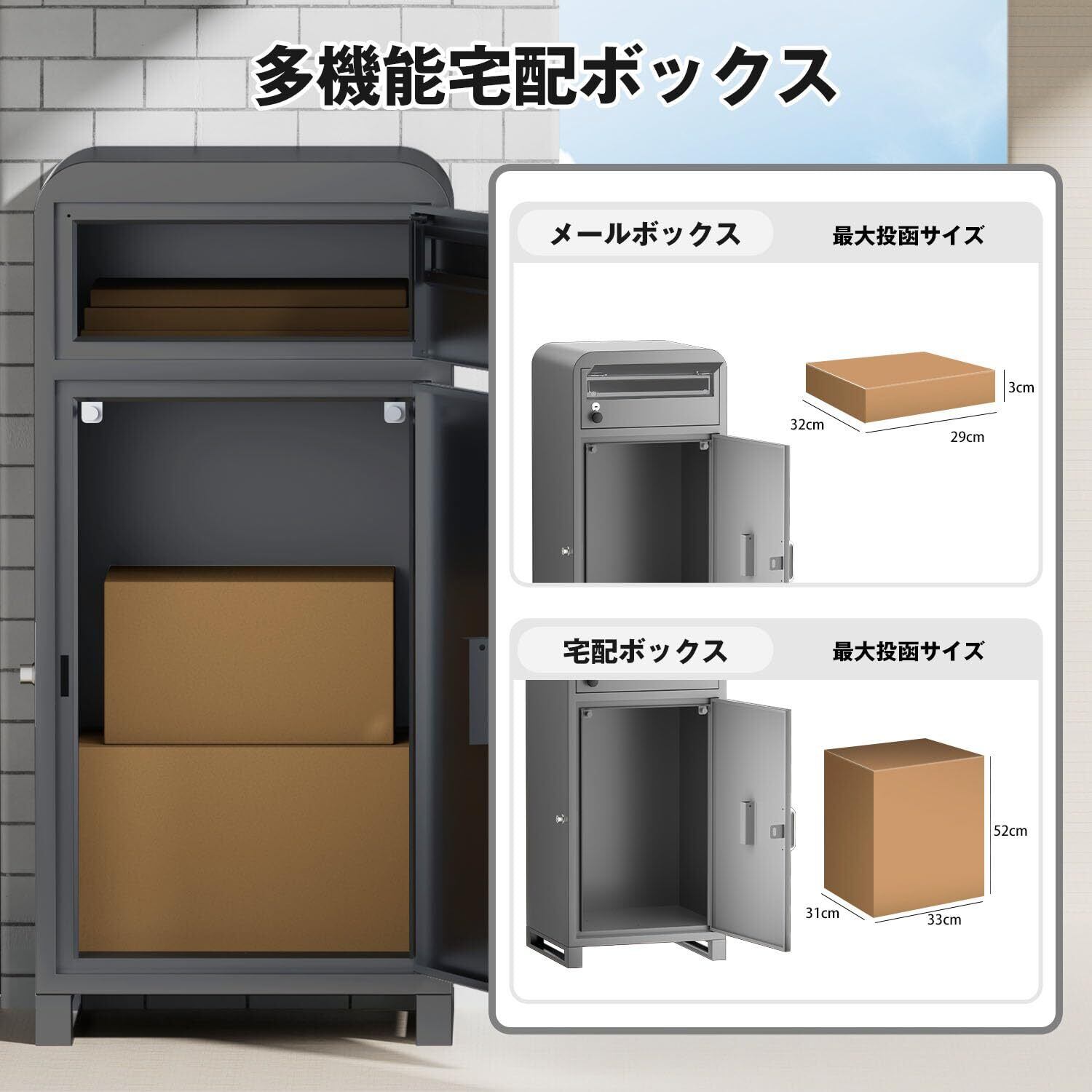 【商品規格・サイズ】 商品サイズ:40*35*85cm メールボックス投函口サイズ:29*3.3cm メールボックス取り出し口サイズ:30.7*12.3cm 宅配ボックス投函/取り出し口サイズ:52*31cm 万が一不良品が届いたり、ご使用中に何か不明点や質問等がございましたら、お気軽にお問い合わせくださいませ。誠心誠意にご対応させていただきます。