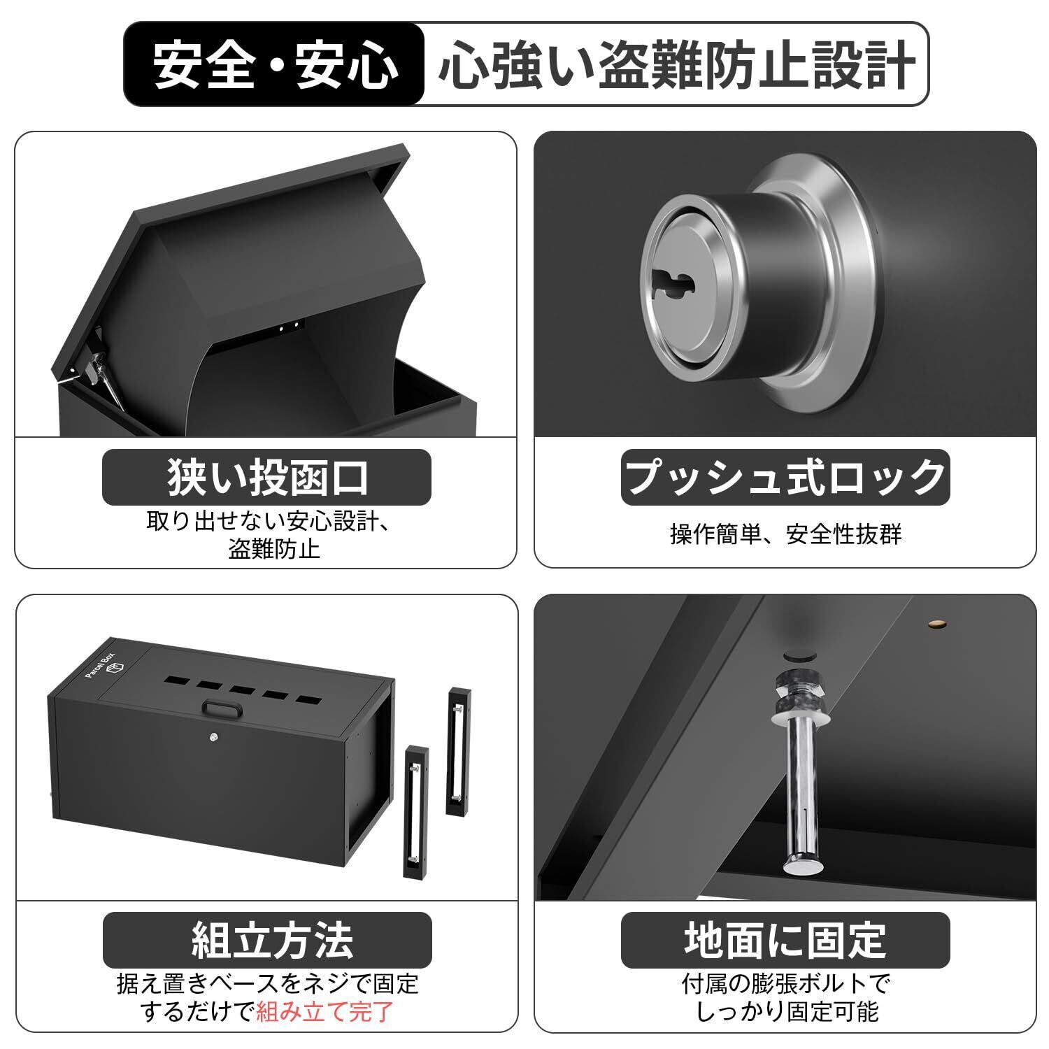 【盗難防止デザイン・安心安全】メインドアは高い防犯性を誇るシリンダープッシュ錠を採用し、スペアキー2本付きでしかも押すだけで簡単に施錠可能。本体内部に盗難防止プレートを取り入れ、上部投函口からの荷物の取り出しはできず、鍵でメインドアを開けて取り出す必要があります。さらに、固定用アンカーセットとワイヤーが付属し、盗難・転倒防止のために地面(コンクリート)に固定することができます。