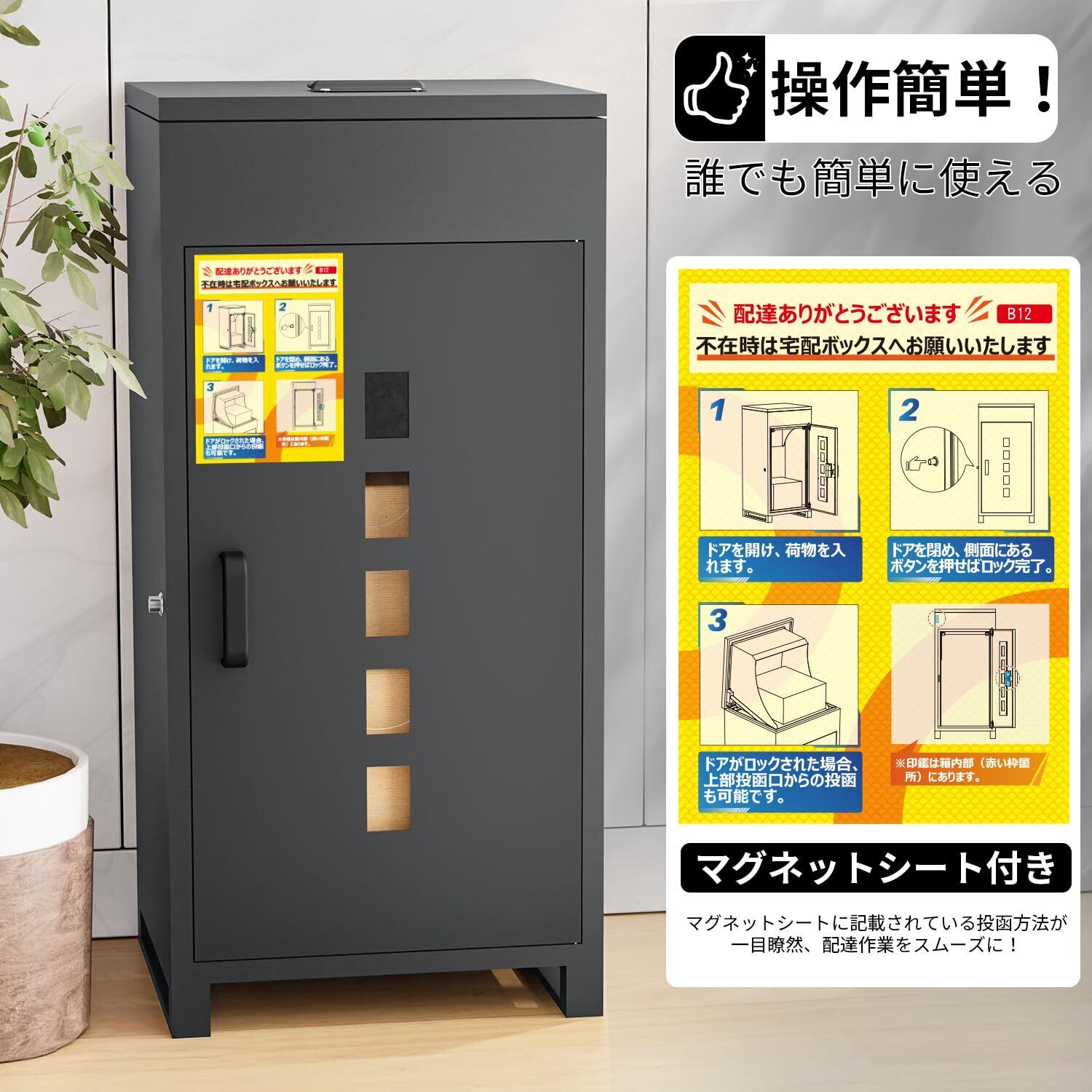 【操作簡単!複数回受け取り可能】宅配ボックスは「投函口が2つ」付属されているため、上部の投函口が複数回投函可能で、下扉は大きめの荷物を受け取れるスペースを確保します。さらに、案内用のマグネットシート付きで、配達員が見やすいところに貼り付ければ、投函方法が一目瞭然、配達作業もスムーズに行われます。