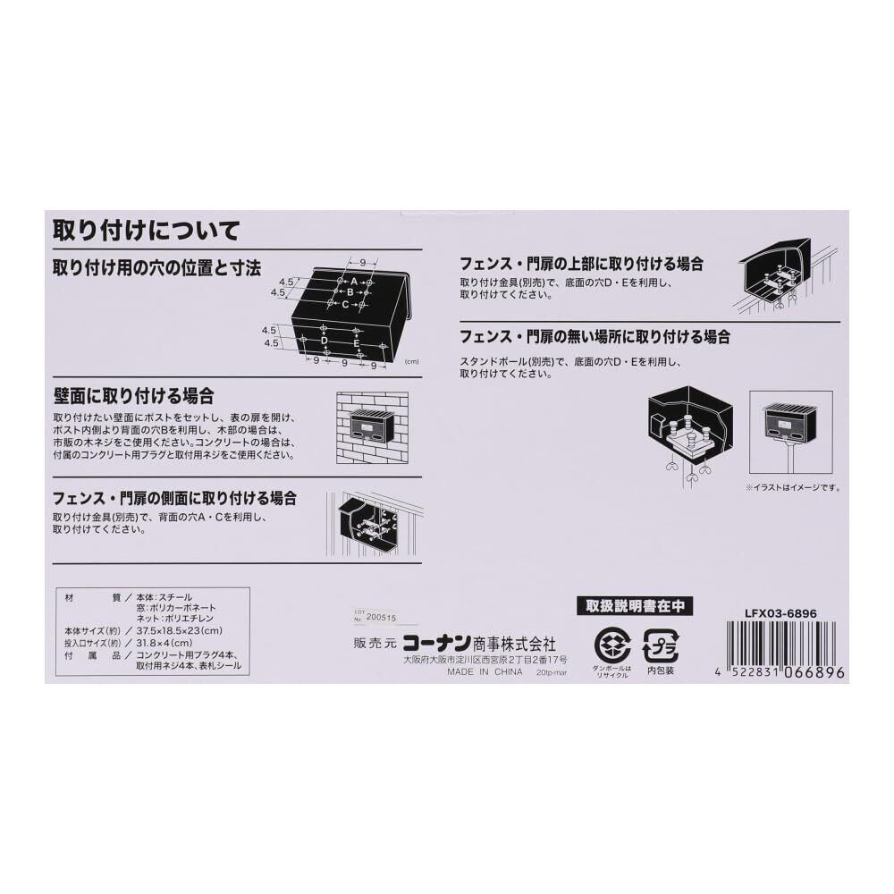 【特長】 ●角3(B5)封筒OK ●南京錠用穴付 ●ポール取付可能 ●確認小窓付 ●角丸 安全設計 ●コンクリート用プラグ&取付用ネジ付属 【仕様】 ●材質:本体/スチール 窓/ポリカーボネート ネット/ポリエチレン ●本体サイズ(約):37.5×18.5×23cm ●投入口サイズ(約):31.8×4cm ●付属品:コンクリート用プラグ4本、取付用ネジ4本、表札シール 【取り付け・使用上のご注意】 ※通行の妨げにならないところに設置してください。 ※取り付けた後、取り付けが安全かつ確実であることを定期的に点検してください。 ※破損・変形などの状態で使用しないでください。 ※本体の取り付けは、木部の壁面の場合は、市販の木ネジをご使用ください。コンクリートの壁面には付属のコンクリート用プラグと取付用ネジをご使用ください。 ※本体の取り付けは、取付用ネジなどで確実に固定してください。落下や盗難の原因になります。 ※取り付け場所は、雨の当たらない軒下、玄関先などを選んでください。場所によっては郵便物や新聞などが濡れる恐れがあります。 ※長持ちさせるために、常にゴミ、砂ぼこり、水濡れなどに注意し、清潔に保ってください。 ※盗難防止のために、郵便物や新聞などはなるべく早く取り出してください。万一盗難に遭われても当社ではその責任を負いかねますのでご了承ください。 ※ポストの上に重いものをのせたり、寄りかかったりしないでください。破損やけがの原因になります。 ※投入口で手を挟まないようご注意ください。けがの原因になります。 ※壁面以外の場所に取り付ける場合は、別売品をお求めください。