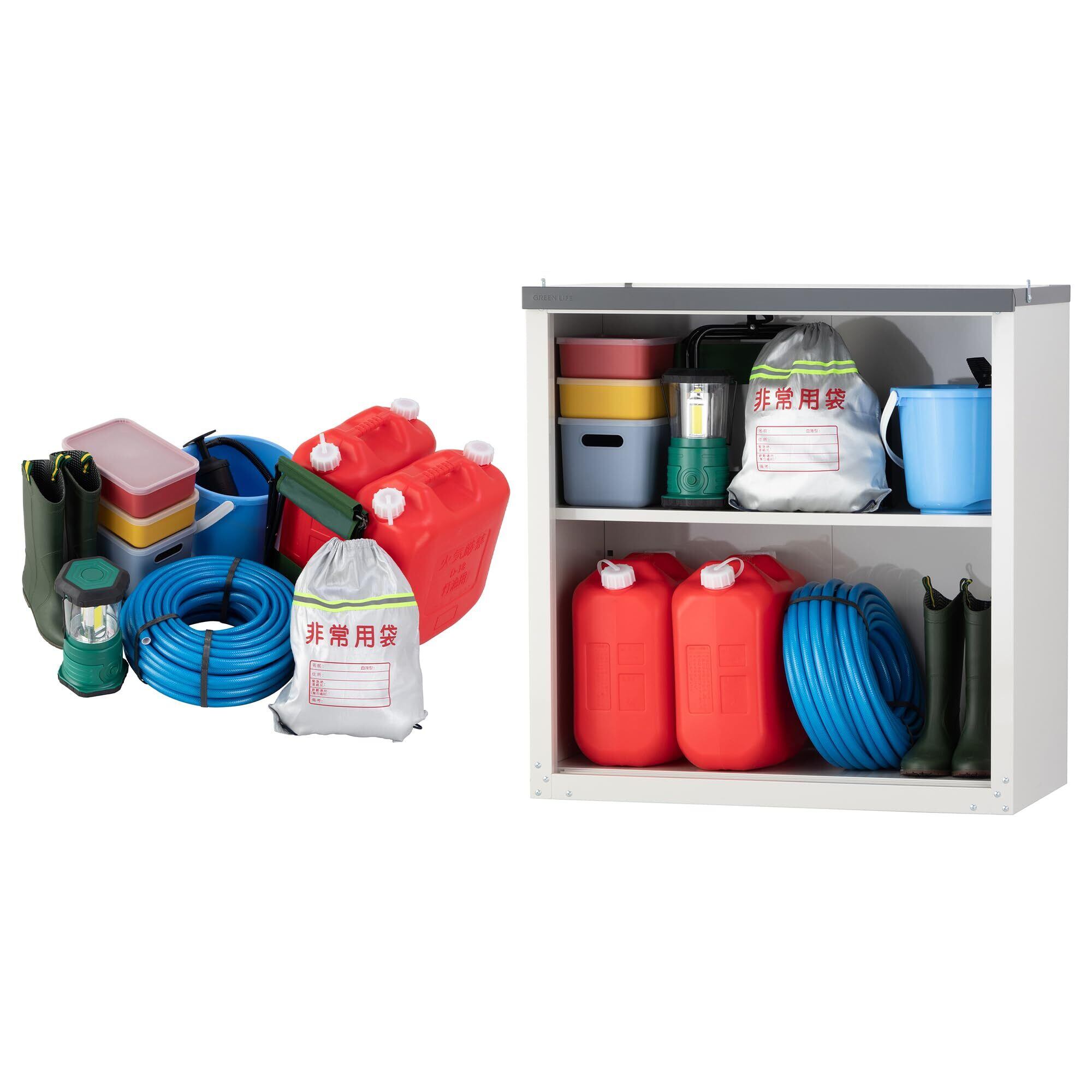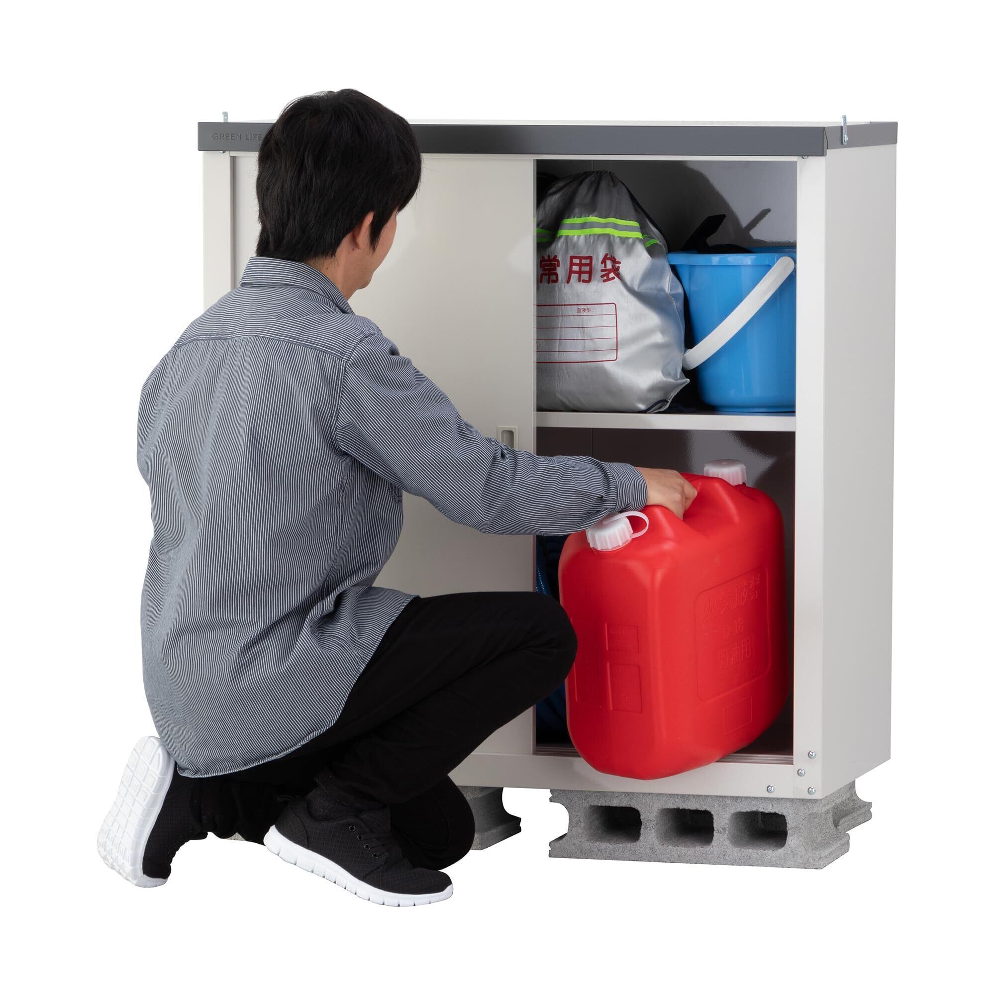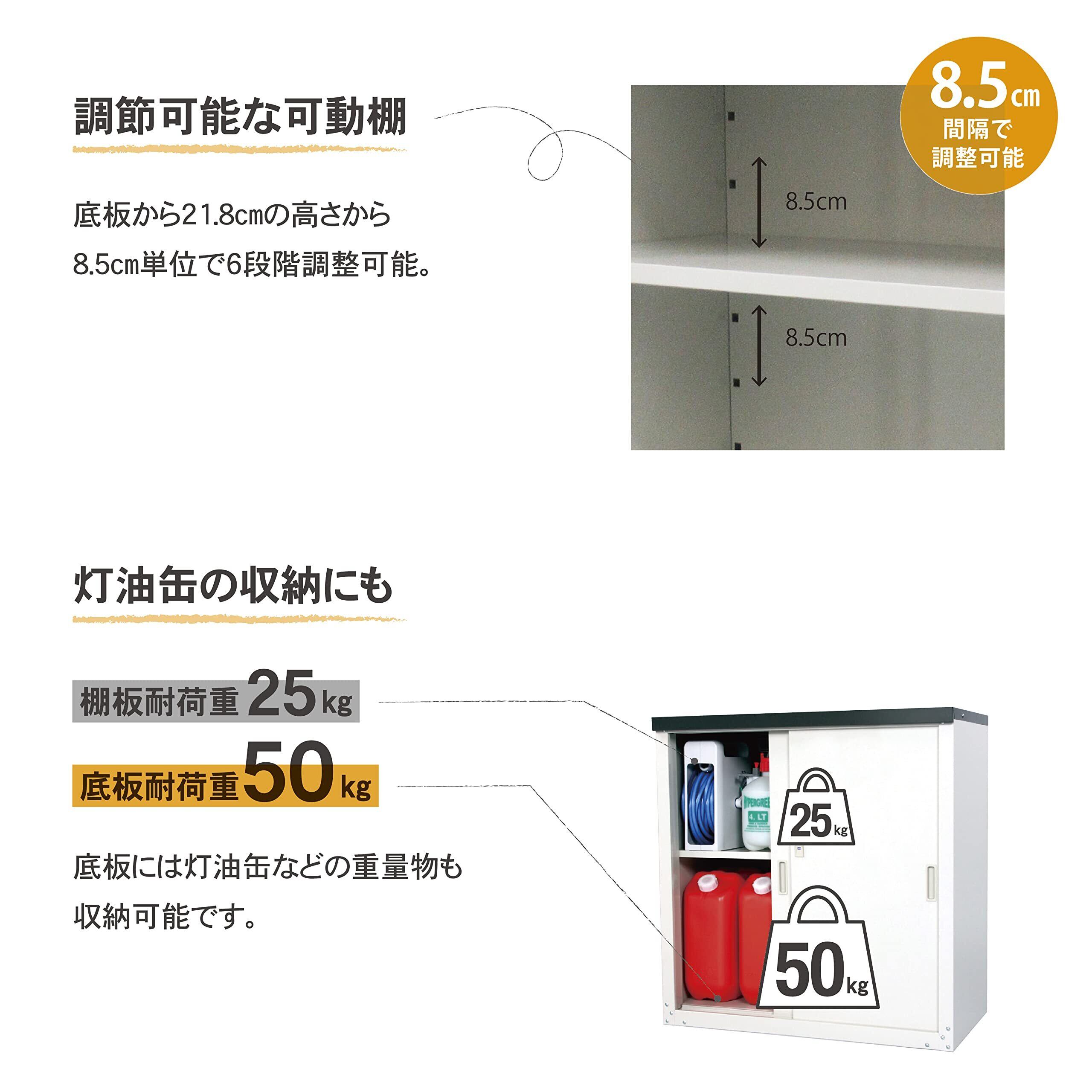 【抜群の収納力】高さは92㎝(内寸87㎝)と高く、底板耐荷重は50㎏。耐荷重25㎏の棚板が1枚付属しており、小柄な収納庫からは想像もできないほどの荷物が入ります。