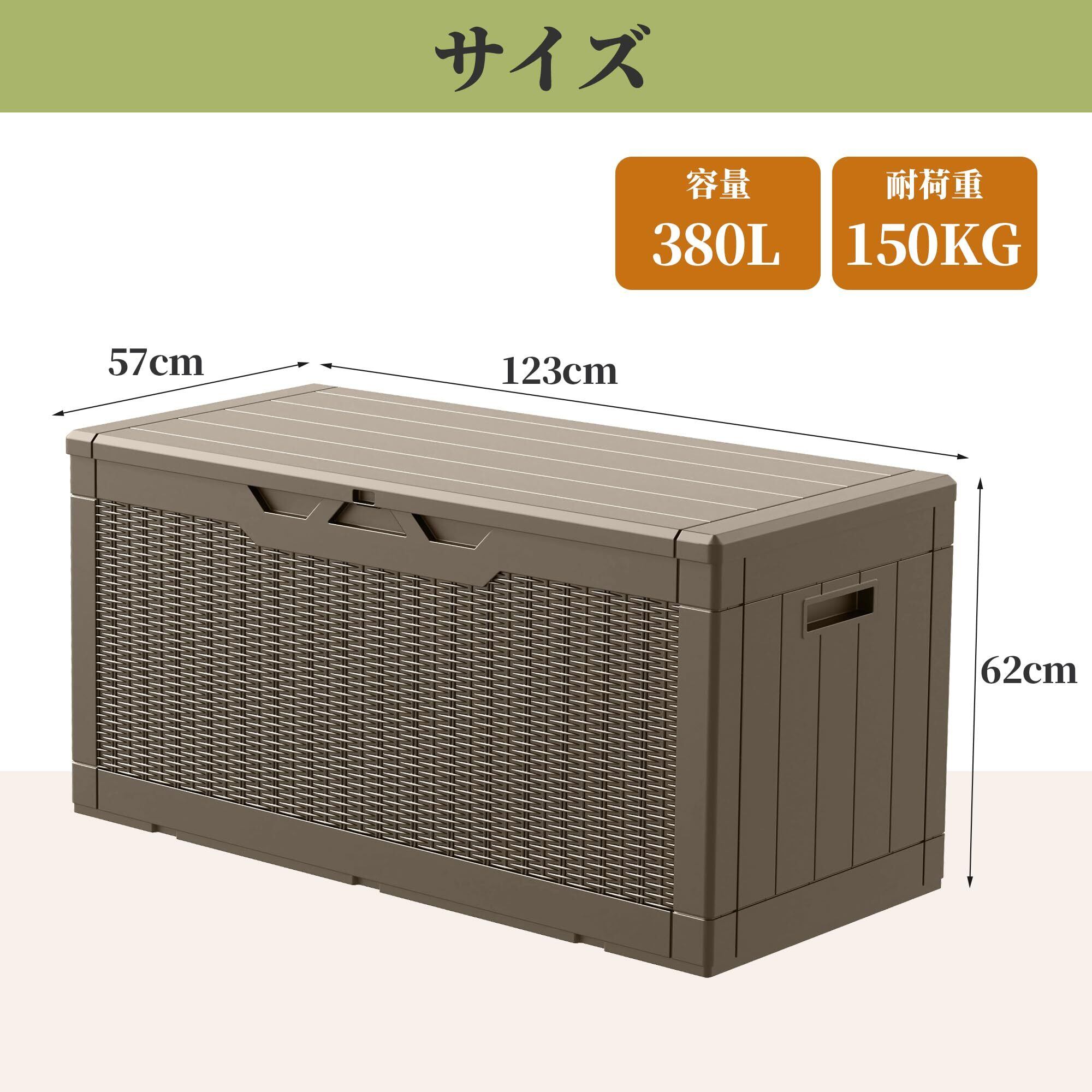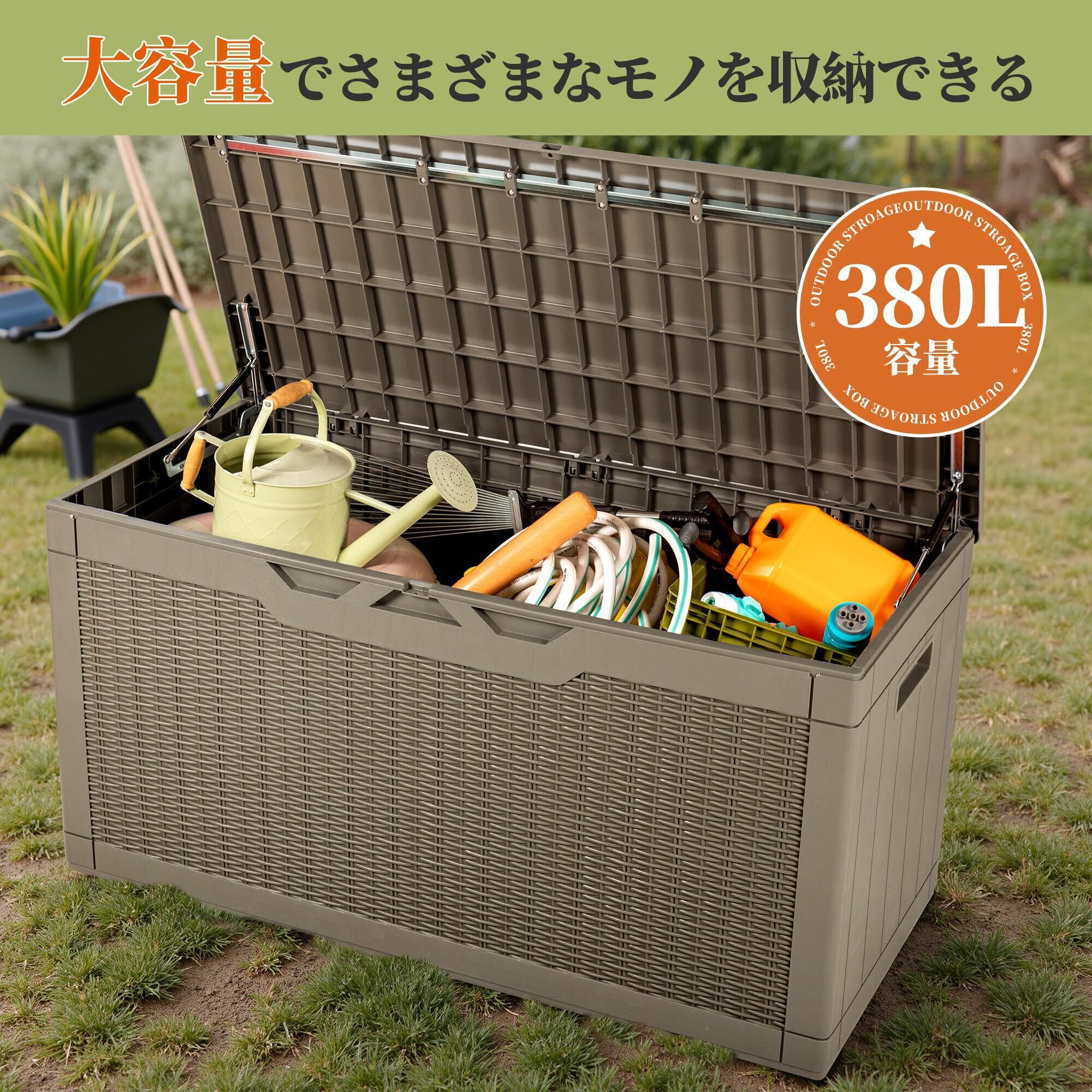 【大容量、さまざまなシーンに対応】大型の収納ボックス、サイズは123*57*62cm、容量は380Lで、収納スペースが広く、様々な物を収納することができます。屋外物置として、庭、ベランダ、ガレージ、倉庫などに置き、ガーデニング・園芸用品、レジャー用品、掃除用具、車の整備工具などを収納することができ大変便利です。ゴミ箱としても使えます。また、屋内の収納スペースとして活用すれば、部屋の雑然とした印象はなくなります。
