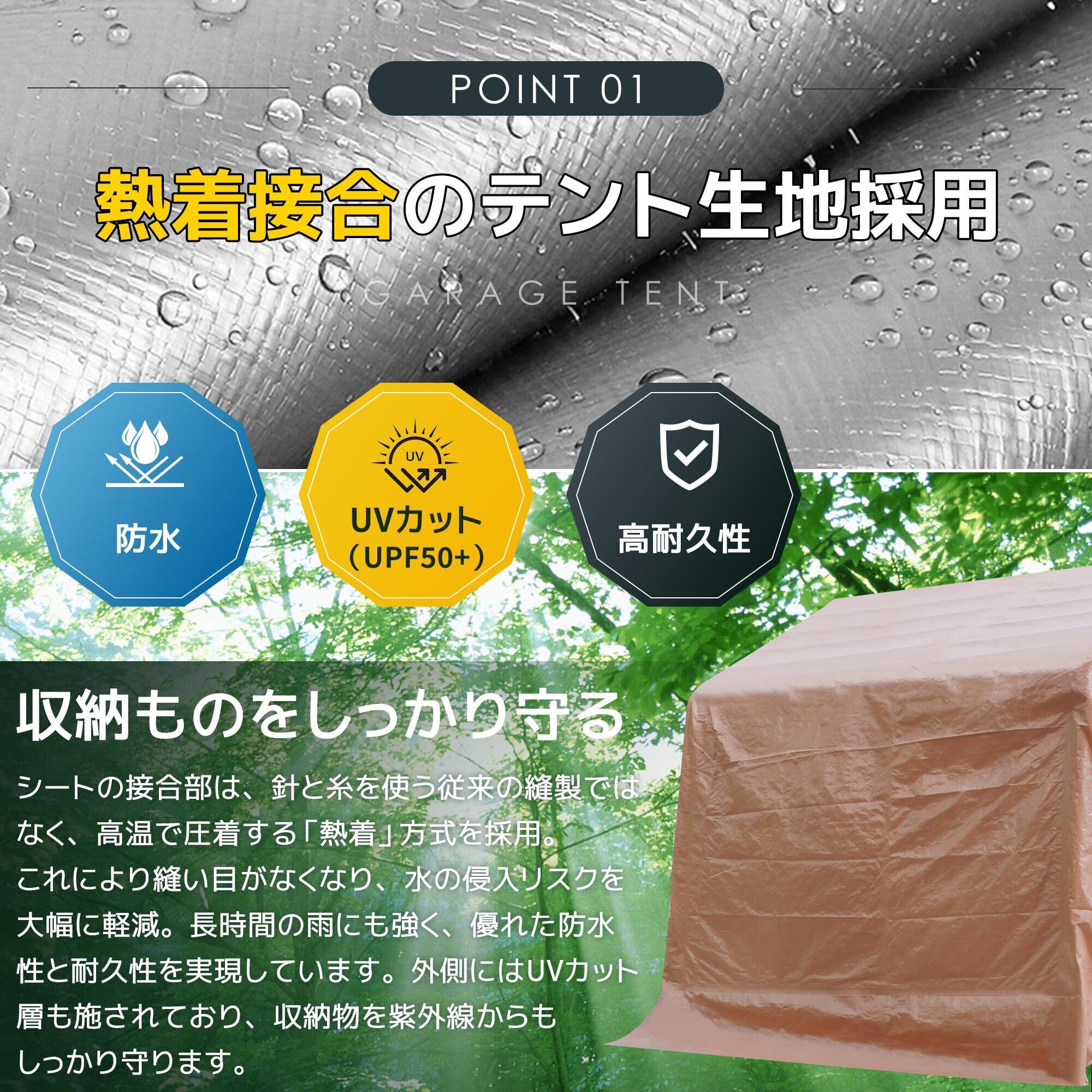 ◎02【熱着接合のテント生地採用】シートの接合部は、針と糸を使う従来の縫製ではなく、高温で圧着する「熱着」方式を採用。これにより縫い目がなくなり、水の侵入リスクを大幅に軽減。長時間の雨にも強く、優れた防水性と耐久性を実現しています。外側にはUVカット層も施されており、収納物を紫外線からもしっかり守ります。(防水 UVカット(UPF50+) 高耐久性)