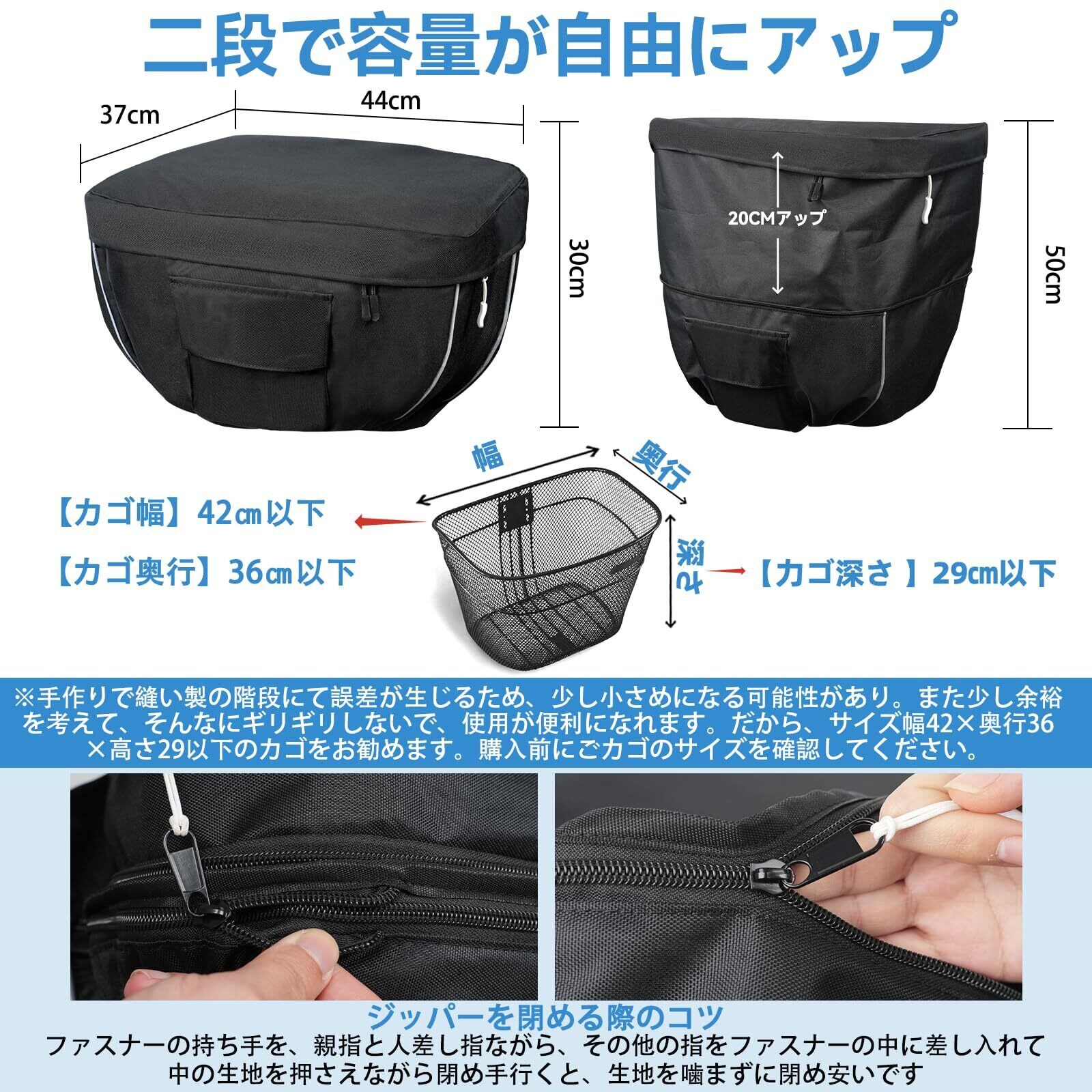 3.容量調整可能:サイズ(約)幅44×奥行37×高さ30~50cm(縫い製の階段にて誤差が生じるため、少し小さめになる可能性がある。実寸は、幅(約43-44㎝)×奥行(約36-37㎝)×高さ(平常時)(約29―30㎝)となります。)ワンファスナー(白い紐付け)を開けると生地が延長されて容量アップして、自転車かごカバー 前 2段式になる!そのジッパーを閉じると元の高さに戻る。荷物の量に合わせて自由にサイズ調整可能。「→平常時の高さ:約30cm」「→容量アップ時の高さ:約50cm」周囲が120~155cm程度のかごに装着が可能。電動アシスト車などの大型/ワイド フロントバスケットにも対応しています *ご注意事項*ごカゴのサイズをちゃんと確認してください。万が一不明があったら、気軽いにに連絡してお願いします。