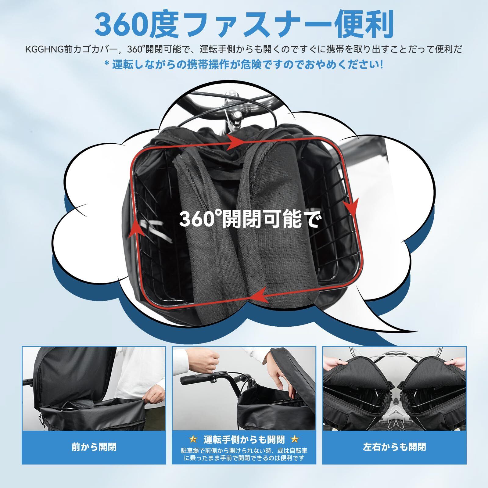 4.360°開閉/色分けジッパー:①通常用ファスナー(黒紐付き)で前後左右に開くことができ、簡単に物を取り出すことができて、とても便利です。②この自転車かごカバー 前 防水は、通常用と拡張用のジッパーが色分けされているので、使いやすさがひと目でわかり、うっかり間違える心配もない