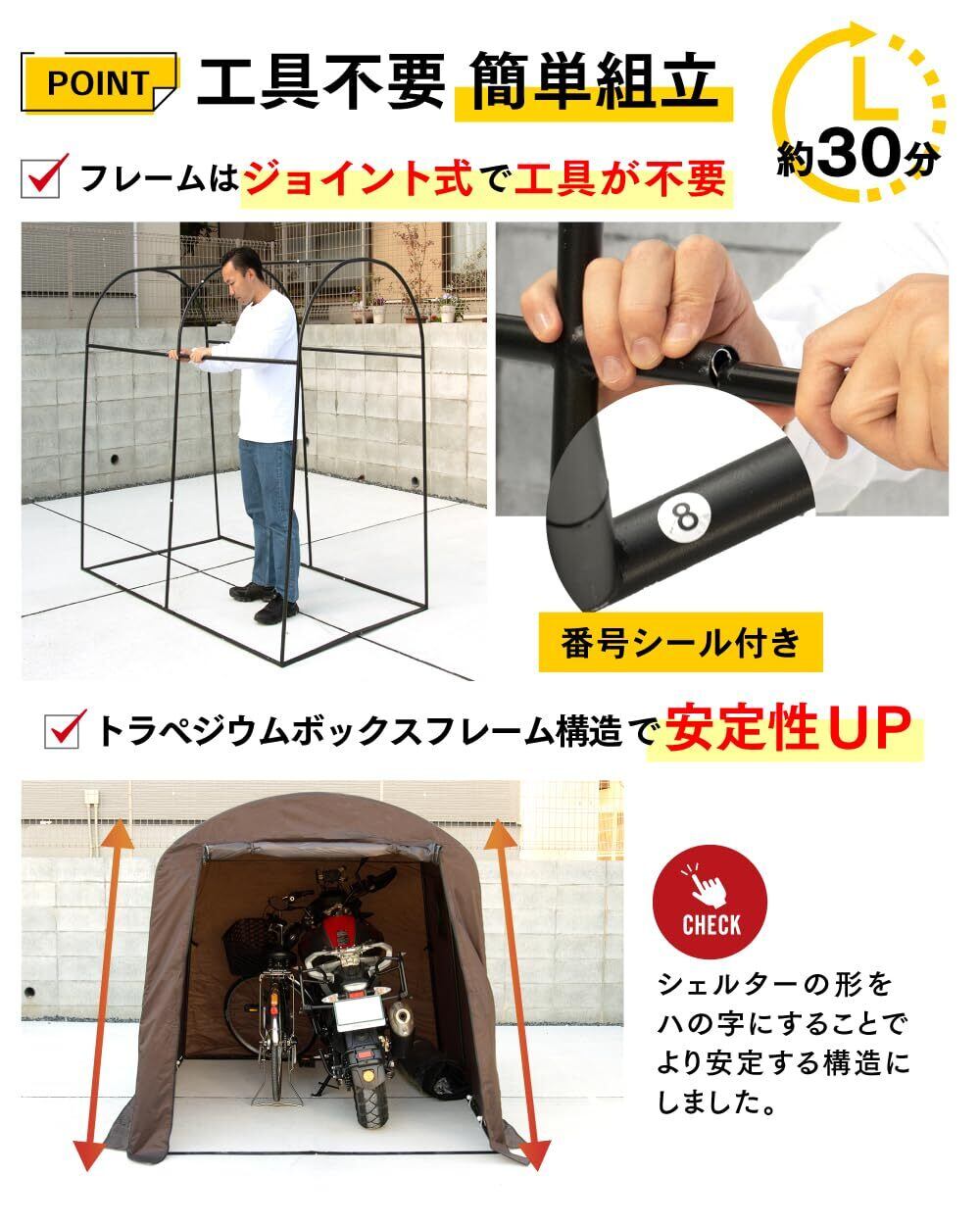 【工具不要の簡単組立て】 当バイクシェルターの組み立てには工具は不要で、フレームは差し込むだけの簡単設計です。フレームには組み立ての順番を示す番号シールが取り付けられていますので、そのシールに従って簡単に組み立てることが出来ます。また日本語の取扱説明書も同梱されていますので、どなたでも簡単に組み立てが可能です。