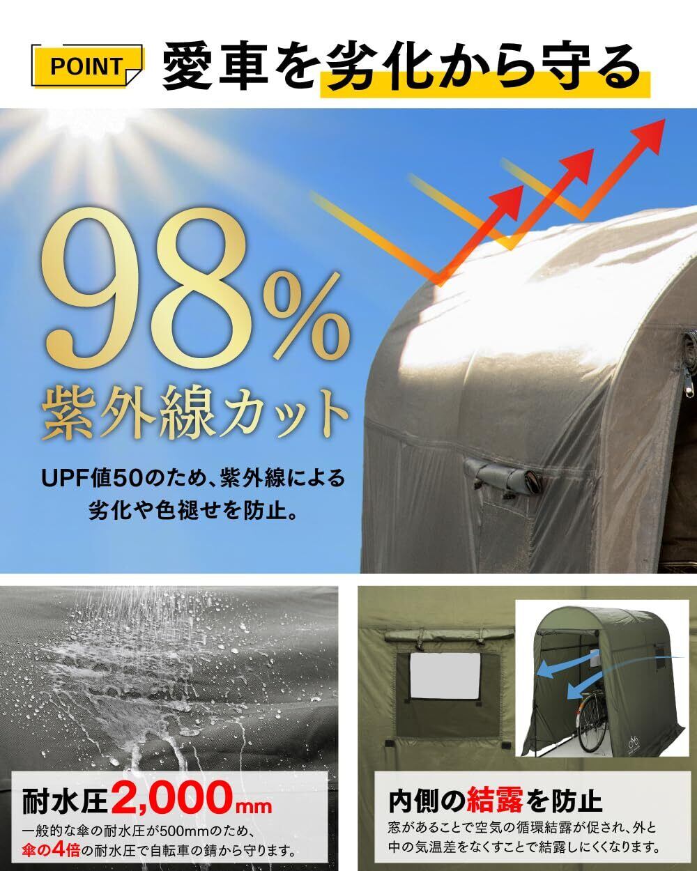 【大切なバイクや自転車を守るリーズナブルなシェルター】 PYKES PEAK( パイクスピーク )より、あなたの大切なバイクや自転車を雨風、日差し、埃から守り、快適な収納を実現します。幕の生地には、高機能ポリエステル生地を採用しています。 本体生地には、キャンプテントなどにも使用される抜群の撥水性と耐久性を兼ね備えた高機能ポリエステル生地を採用しています。シート裏面にPUコーティング加工された高耐水加工生地は、最大2,000mmの耐水圧を誇ります。シートの縫い目部にはシームテープ加工を施し、雨や水滴の侵入を軽減します。さらに、UV加工が施された生地は、UPF値50の高いUV防止効果を発揮し、大切な愛車を雨や湿気、太陽光からの紫外線などから保護し、愛車の劣化や色あせを最小限に抑えます。