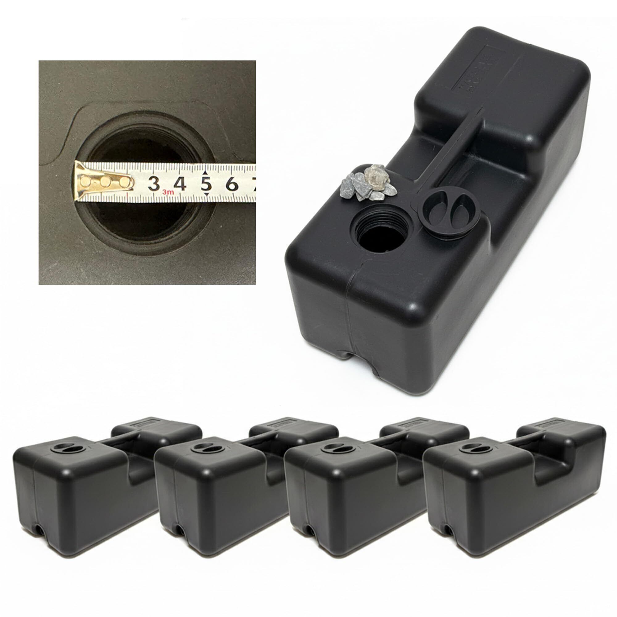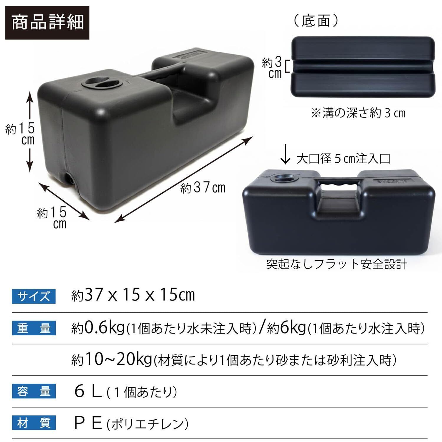 【商品内容】重石4個セット 容量:6L/1個あたり サイズ:幅37奥行15高さ15cm 溝の幅と深さ3㎝ 素材:ポリプロピレン 注入口口径:5㎝