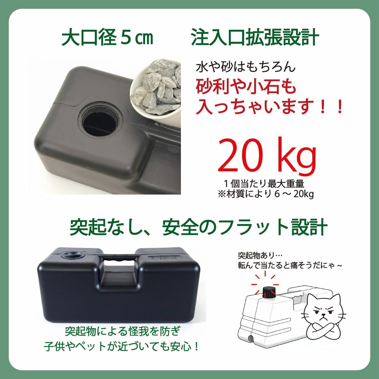 【大口径&多材質填充可能】 大口径注入口で、注水・砂・砂利・小石もOK 通常の注水式ウェイトと異なり、口径を拡張設計により、水を入れるだけでなく、砂・砂利・小石など用途に合わせて填充素材を選べます。環境に応じて重さ調整が可能です。填充物によって1個あたり最大重量6~20KG超