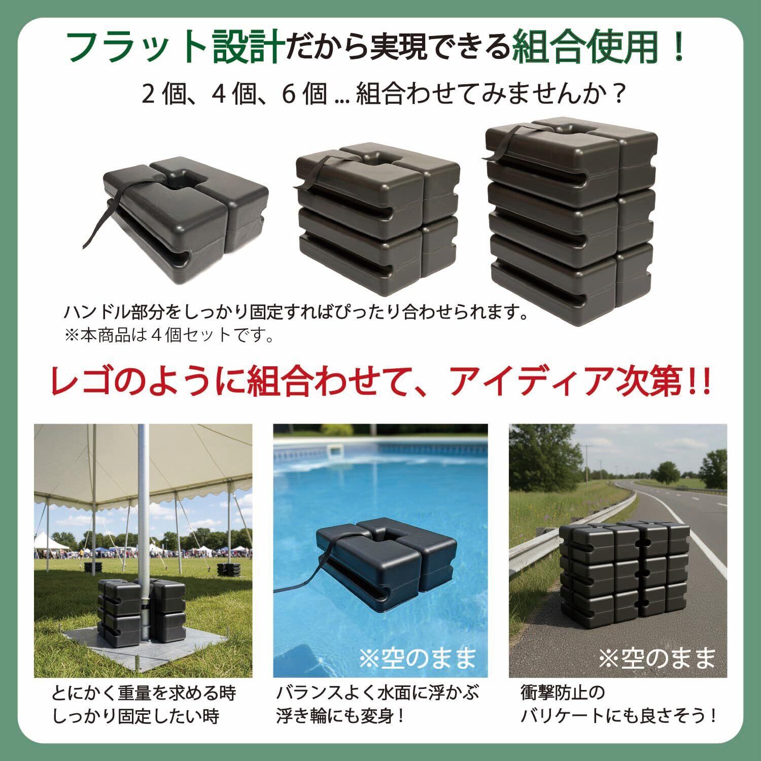 【組合使用】この製品は、フラット設計で2つ、4つ、6つ・・・複数個をピタッと合わせることができます。レゴのように組合わせて使用してみませんか。とにかく重量が欲しい、しっかり固定したい時は重量は数倍にもなります。また発想の転換で空っぽのままで浮き物になったり、バリケードになったり。アイディア次第でたくさん面白い使い方ができます。